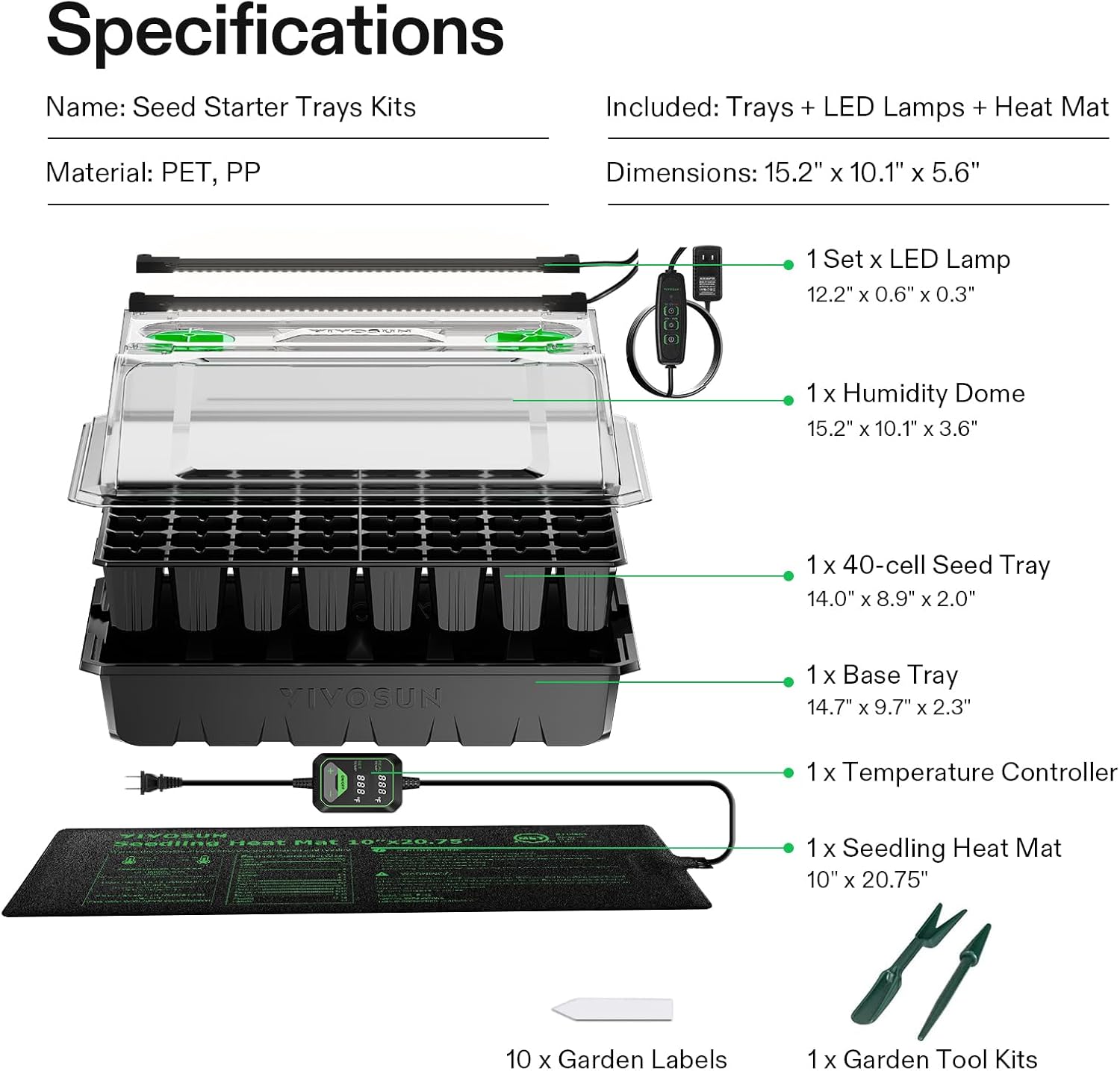 VIVOSUN 1-Pack 40-Cell Seed Starter Trays with 1 Set of LED Lights and 10"x20.75" Seedling Heat Mat, 3.6" Higher Cover, Adjustable Vents, Drainage Holes, Green Propagation Tray for Planting Seeds