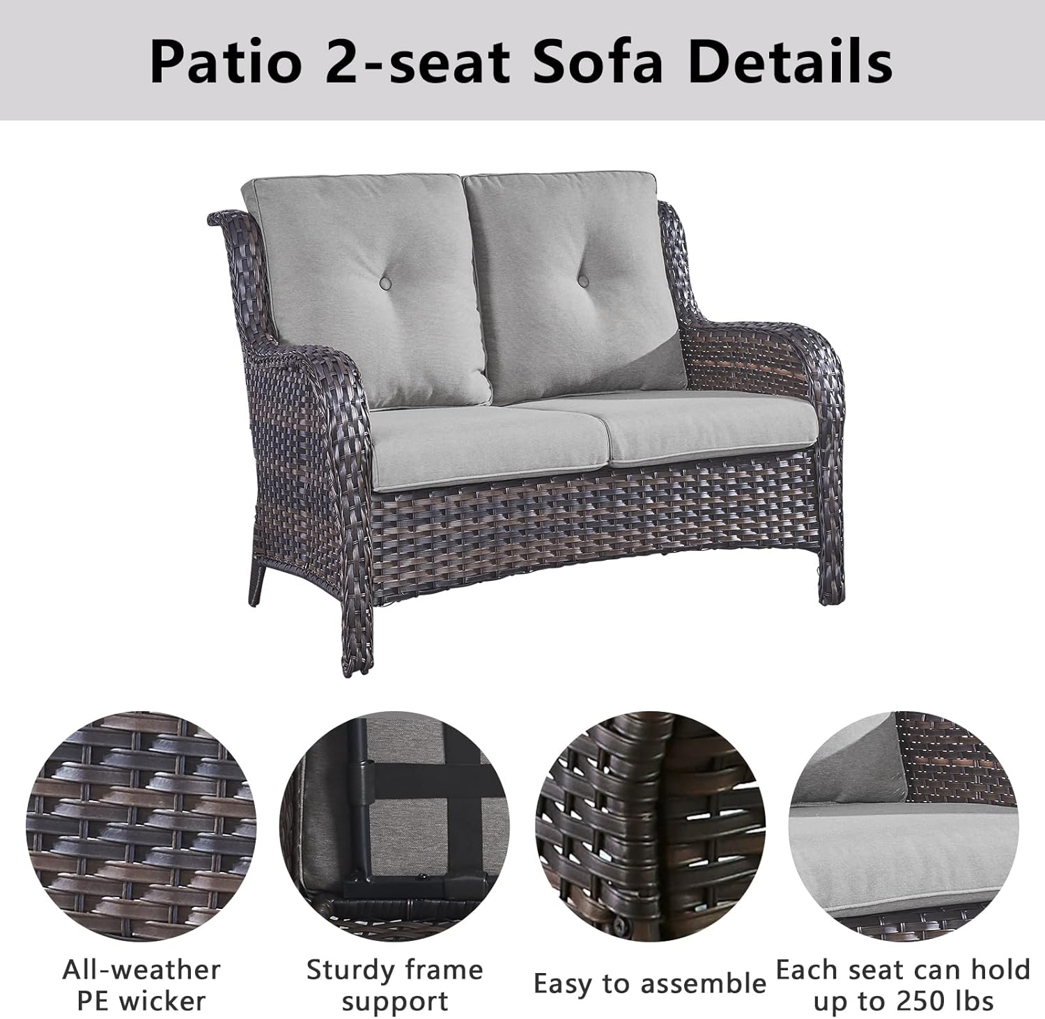 - 1.Patio Loveseat Details: This patio couch includes a total of one 2-seater sofa with thick cushions. Space saving but meets any needs in Gazebo, Backyard. High load-bearing iron frame. L53*W35*H35 inches, seat height is 18 inches with the cushion.