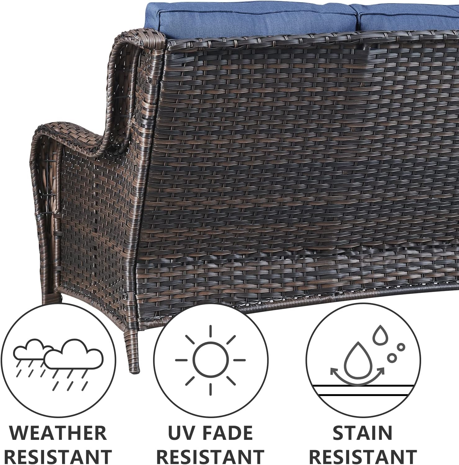 - 3.Durable Material: This outdoor wicker sofa is made of hand-woven weather-resistant PE rattan and powder-coated steel frame, which makes the sofa couch stronger and more durable. The wicker sofa can hold up to 600 pounds of weight capacity.