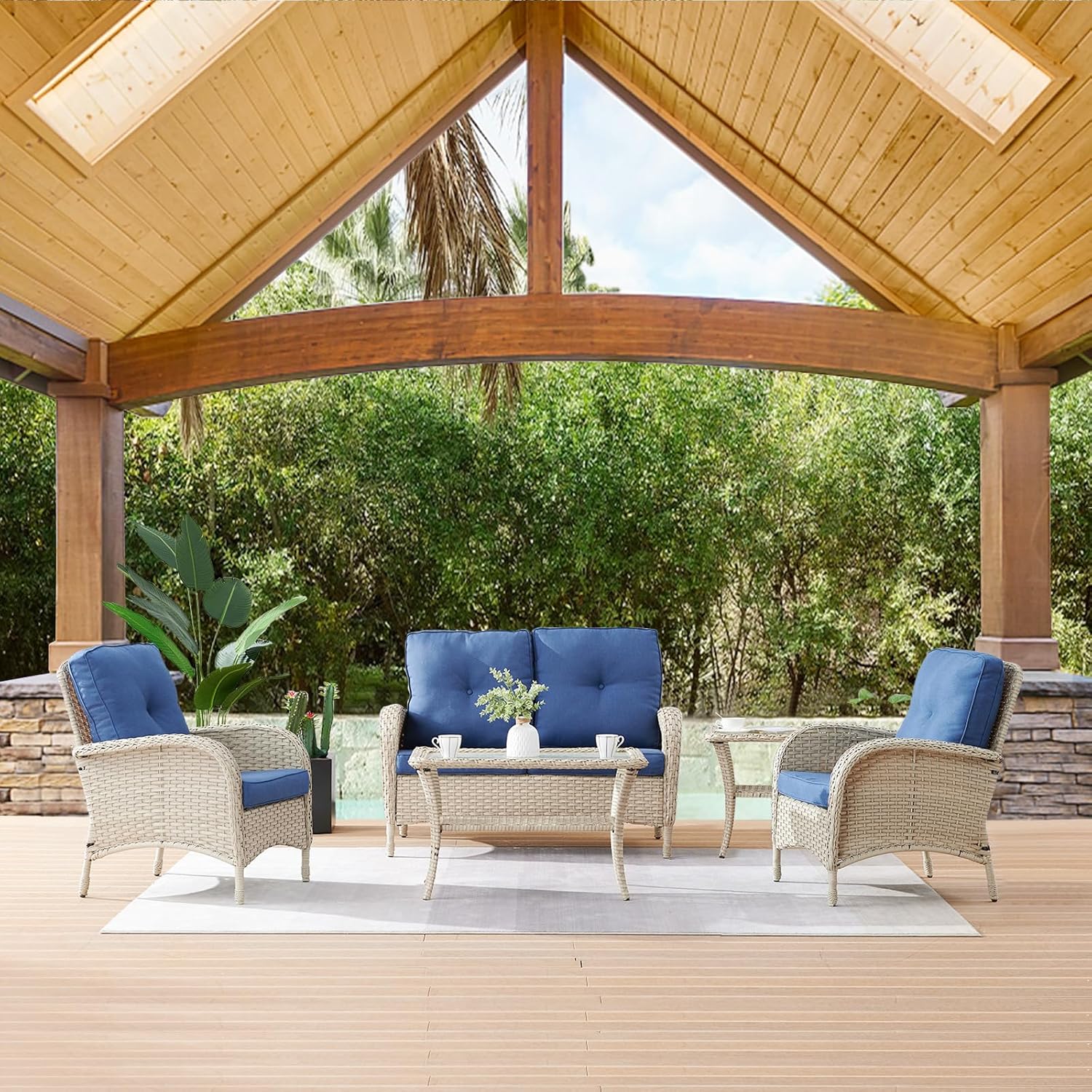 HUMMUH 4-Piece Patio Furniture Wicker Outdoor Conversation Set,All-Weather Rattan Outdoor Bistro Set with Loveseat Chairs Coffee Table for Backyard,Poolside,Deck