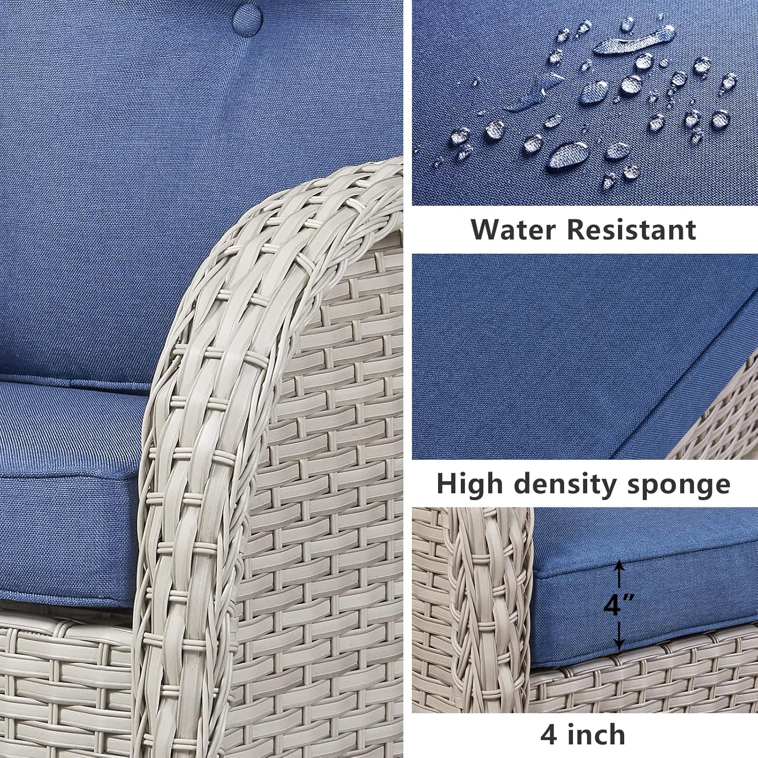 - Comfy Spot for Relaxation:Create an instant gathering spot on your porch or garden with this 4-person seating patio set.This outdoor sectional furniture includes one loveseat, two rotating gliding chairs, One 2-layers coffee table and a side table. 4'' Thick cushions add more comfortable experience.