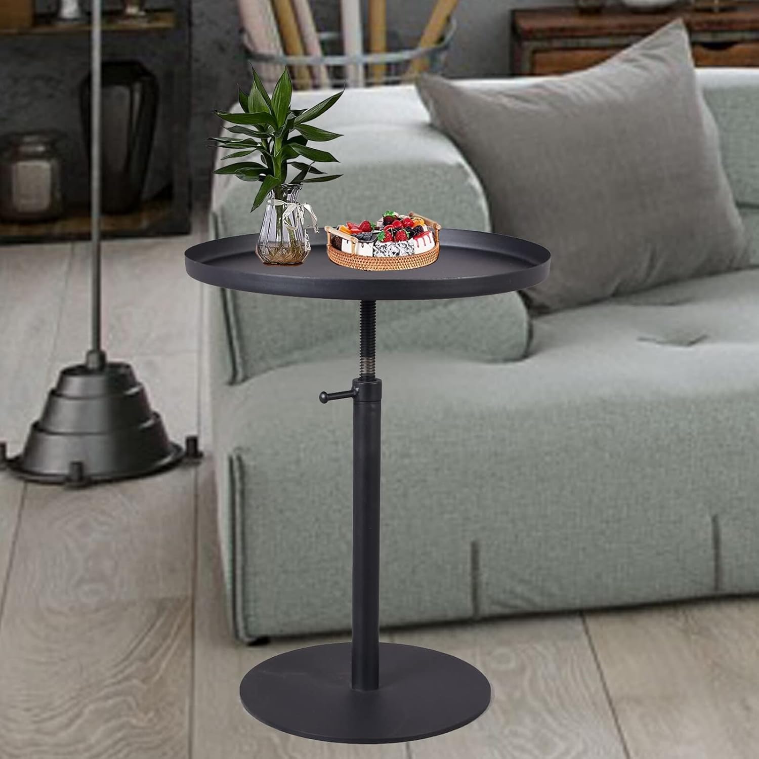 Outdoor Side Table,Tray Metal Sofa End Table, Accent Coffee Table, Adjustable Height, Waterproof and Anti-Rust Outdoor&Indoor Snack Table, Black (Round Top)
