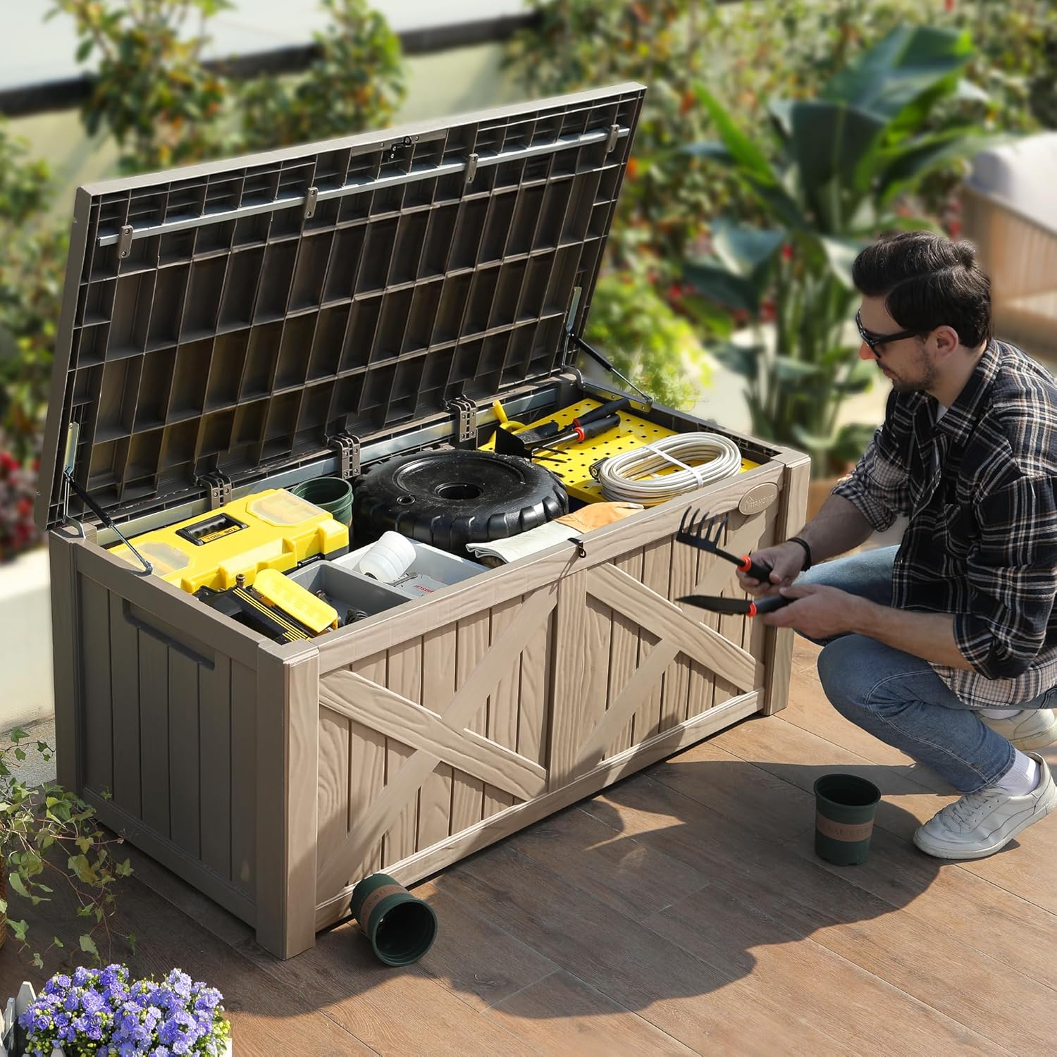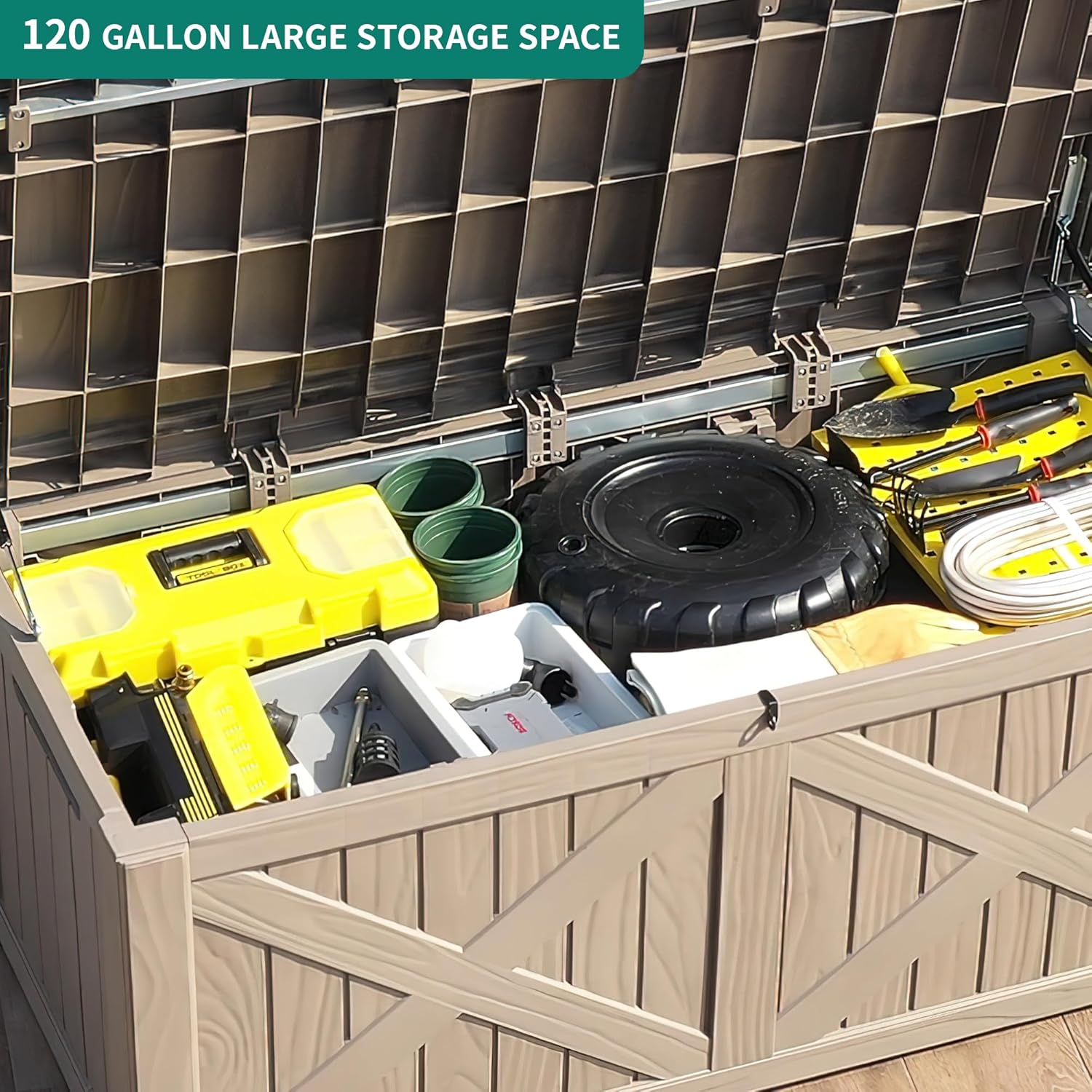 - LARGE STORAGE SPACE- 120-gallon capacity results in a roomy storage solution for your garden tools, pool supplies, sporting equipment, etc., on patio, deck, or porch; Featuring 440lbs. weight capacity, this waterproof outdoor storage box can double as an extra table or patio bench to accommodate two adults.