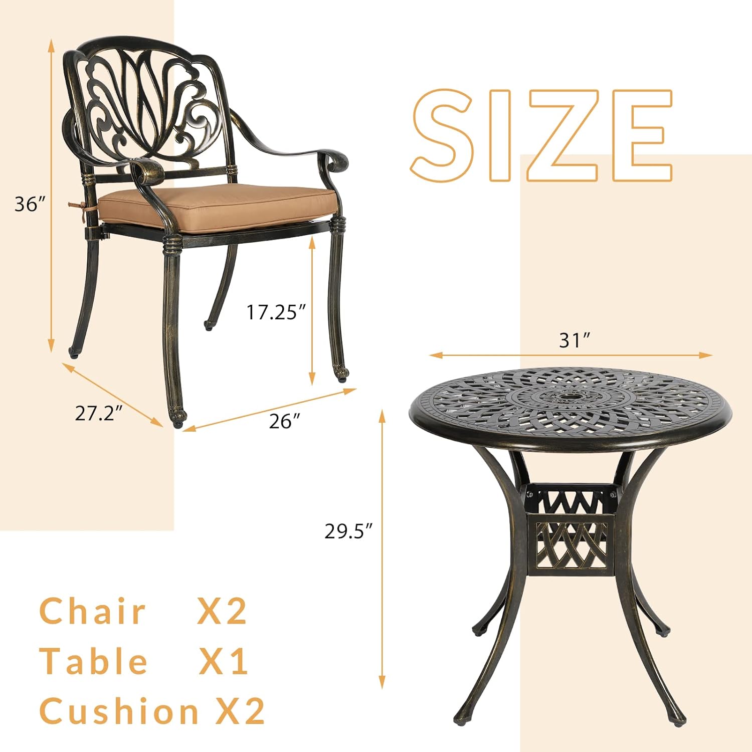 - 【Dimensions】 - Our round table is 31"(Dia) x 29.5"(H), and each of 2 chairs is 26''(L) x 27.2''(W) x 36''(H), cushion is 19''(L) x 19''(W) x 2.8''(H), you’ll love how this furniture set uniquely accents your space. Quickly assemble so you can enjoy it in no time, all hardware, tools and instructions required are included for easy assembly.