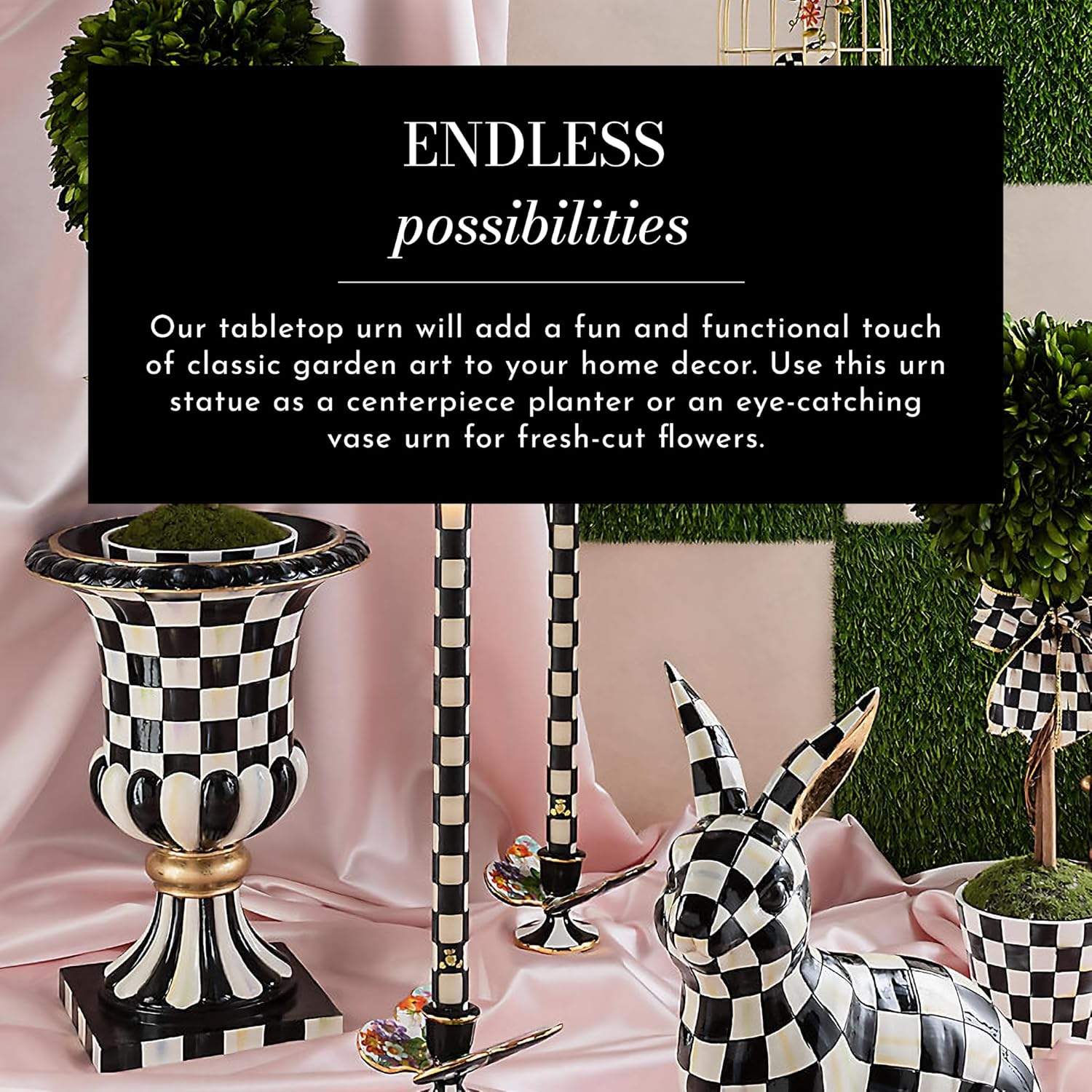 MACKENZIE-CHILDS Pedestal Tabletop Urn, Decorative Centerpiece for Table, Mantel, or Shelf, Tall, Gray-and-White Sterling Check