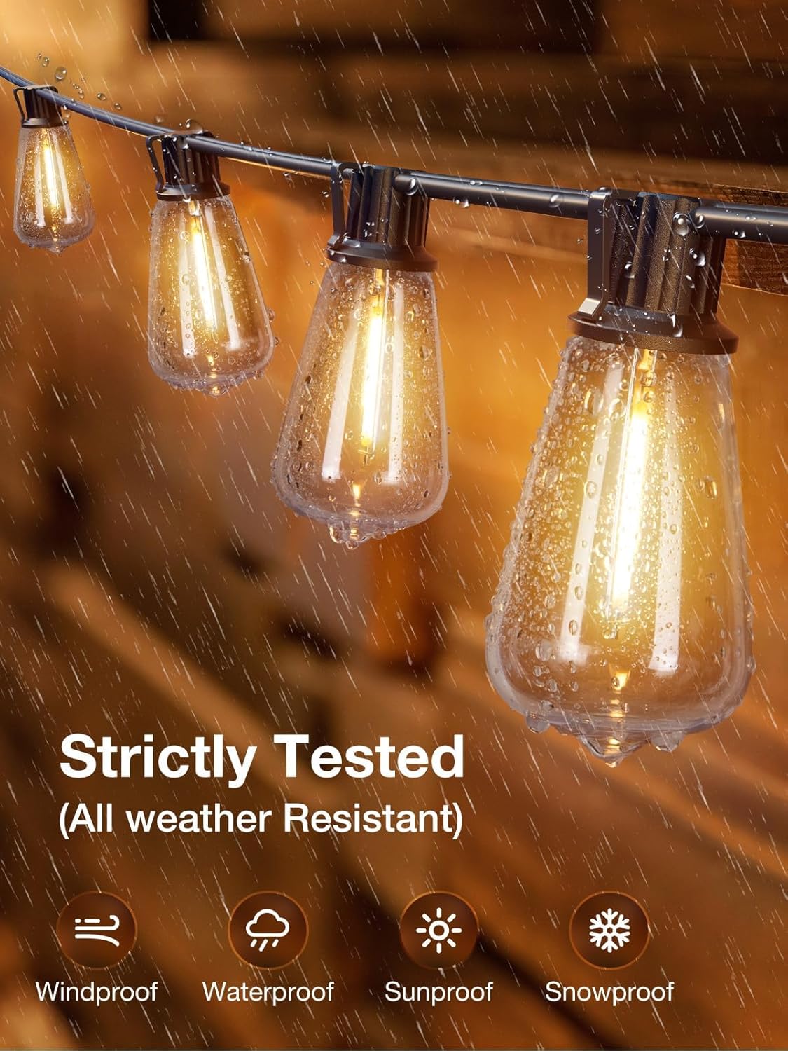 - 【Weatherproof and Shatterproof】IP65 Waterproof led string lights can withstand cloudy, damp, windy, foggy, rainy, snowy, or extreme temperatures,This making it ideal for year-round use in outdoor spaces like patios, gardens, and bistros, creating a festive and inviting atmosphere.Besides, these led bulbs made from unbreakable PET material and hard anti-drop plastic shells,This ensures the safety of your family, as there is no risk of broken glass shards while hanging these backyard lights