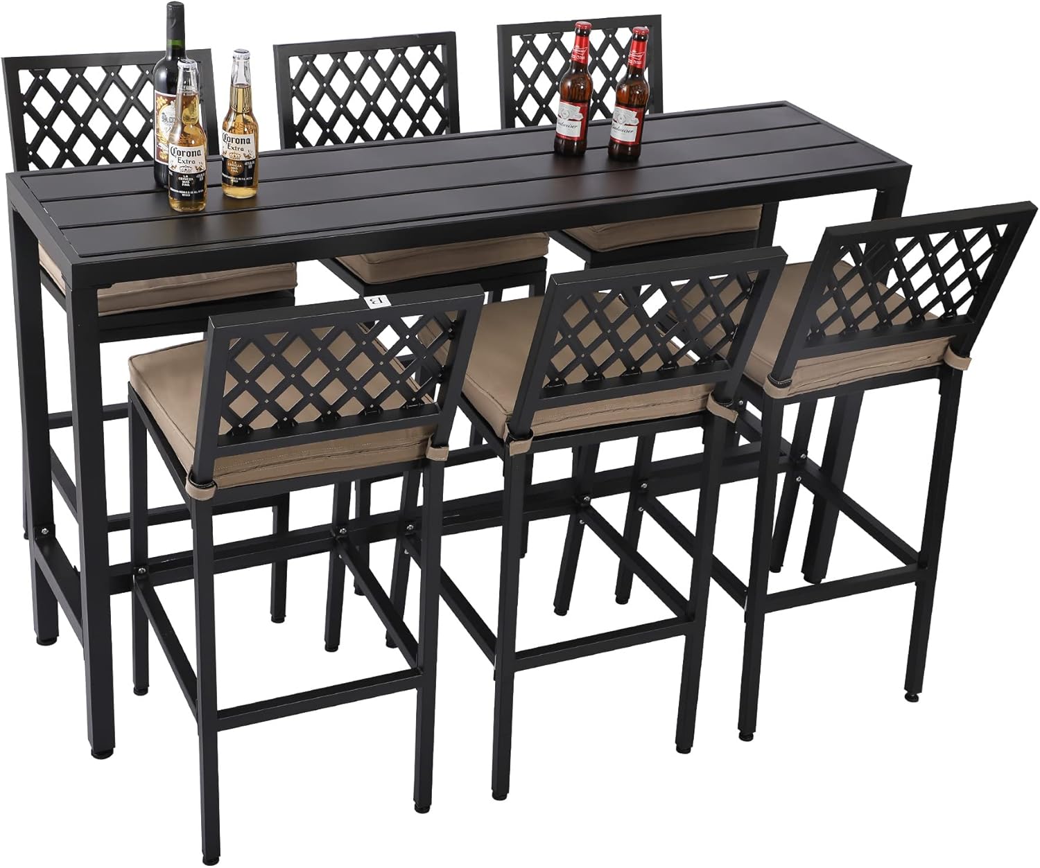 - Space-Saving Design: The bar height patio dining set is ideal for small space, and can be placed for corner. When the bistro bar set is not in use, the 6 bar stools could slide under the table, which could save your space