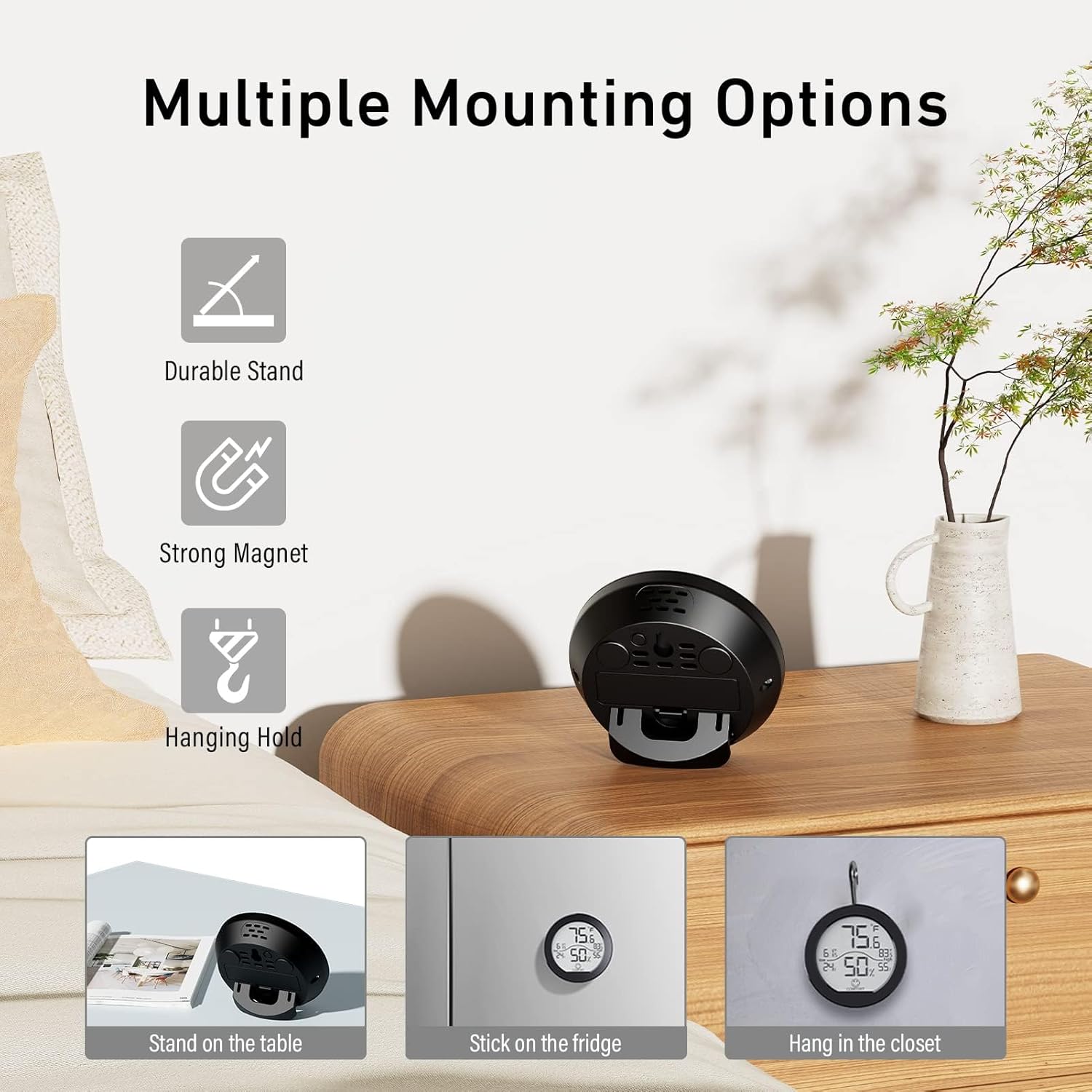 - 〖3 Ways to Install〗 Our digital humidity monitor may be mounted on a wall using a single nail, attached to the refrigerator using the built-in magnet or used on any flat surface using the stand.