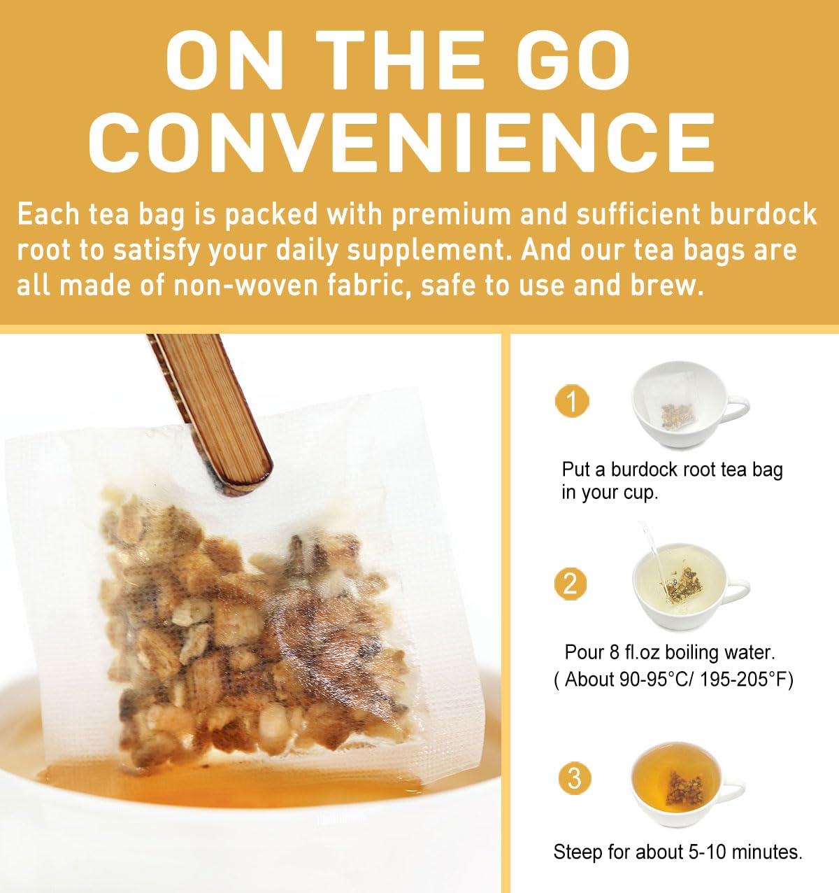 - EASY TO USE: 60 burdock root tea bags are placed in a resealable bag to keep them fresh. Just take one and place it in the cup, add 8 fl.oz of boiling water. Steep for about 5-10 minutes. Take out the tea bag then enjoy this burdock root tea;