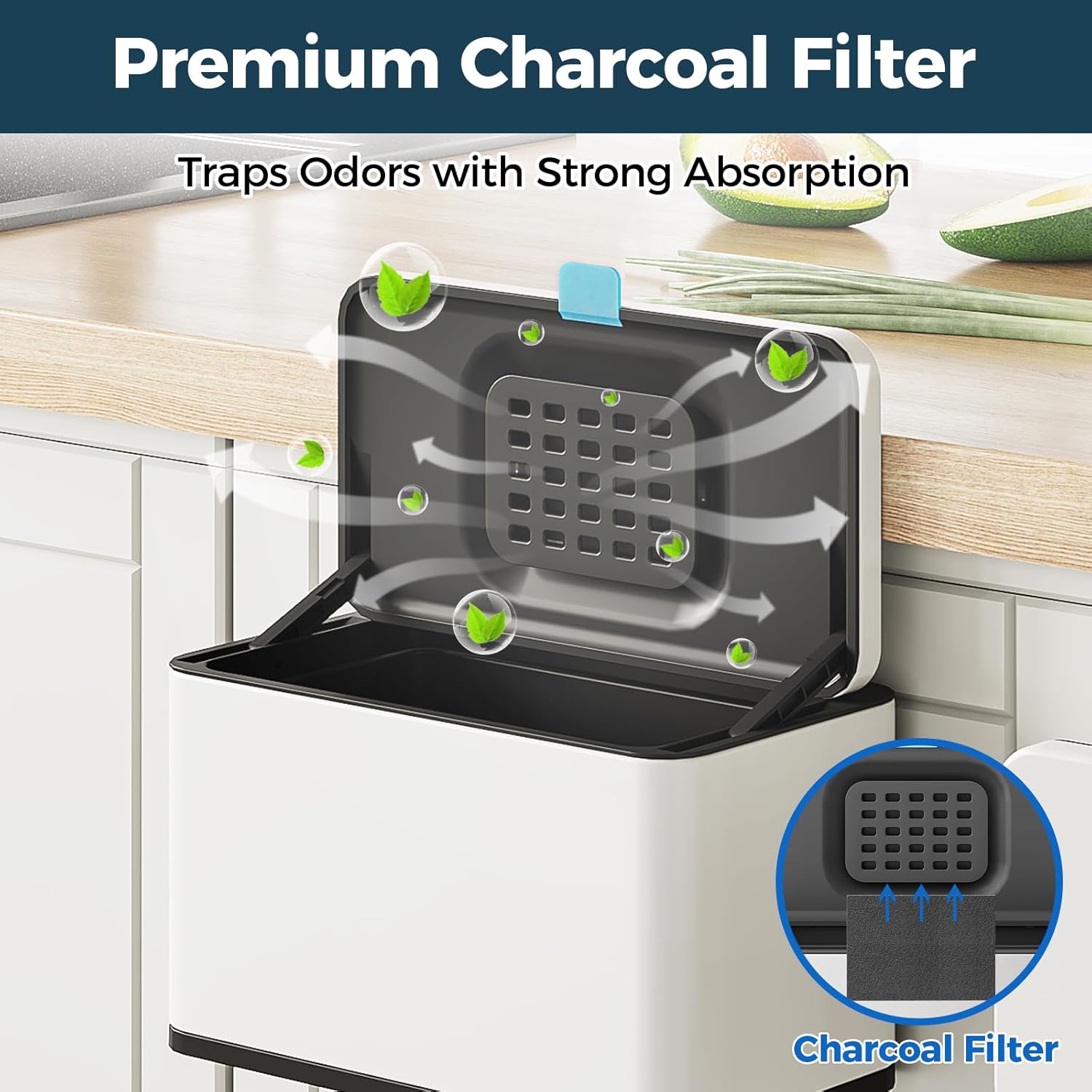 - Odor Absorbing Filter - The activated-charcoal filter included inside this trash can (NOT in other brands) traps and absorbs odors without leaking funky smells. Stainless steel trash can with lid enhances the sealing effect, specifically designed to hide smelling and fruit fly free.