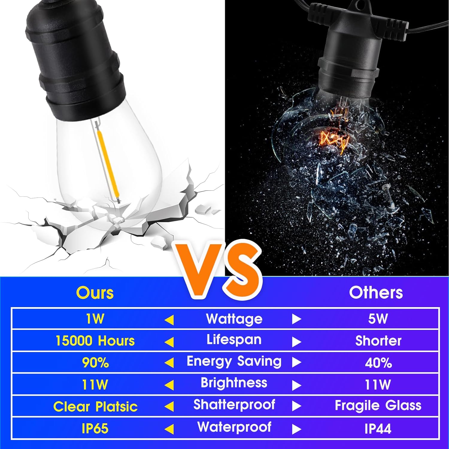 - ăWeatherproof&ShatterproofăEdison light string can create a romantic atmosphere for you, which can bear sun, wind, rain, snow or other extreme temperature during outdoor using. S14 plastic bulbs are shatterproof and durable