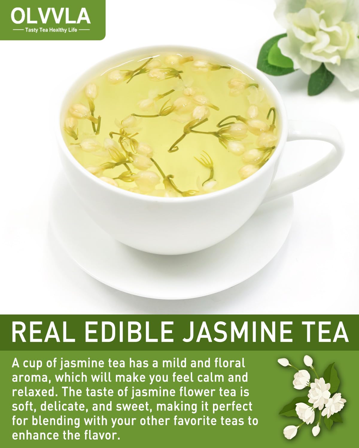 - NATURAL AROMA: Harvested before blooming, Olvvla jasmine flowers are dried under advanced low-temperature method. Although some of the aroma will evaporate, you will still smell the natural and mild fragrance of jasmine, without pungent flavor;