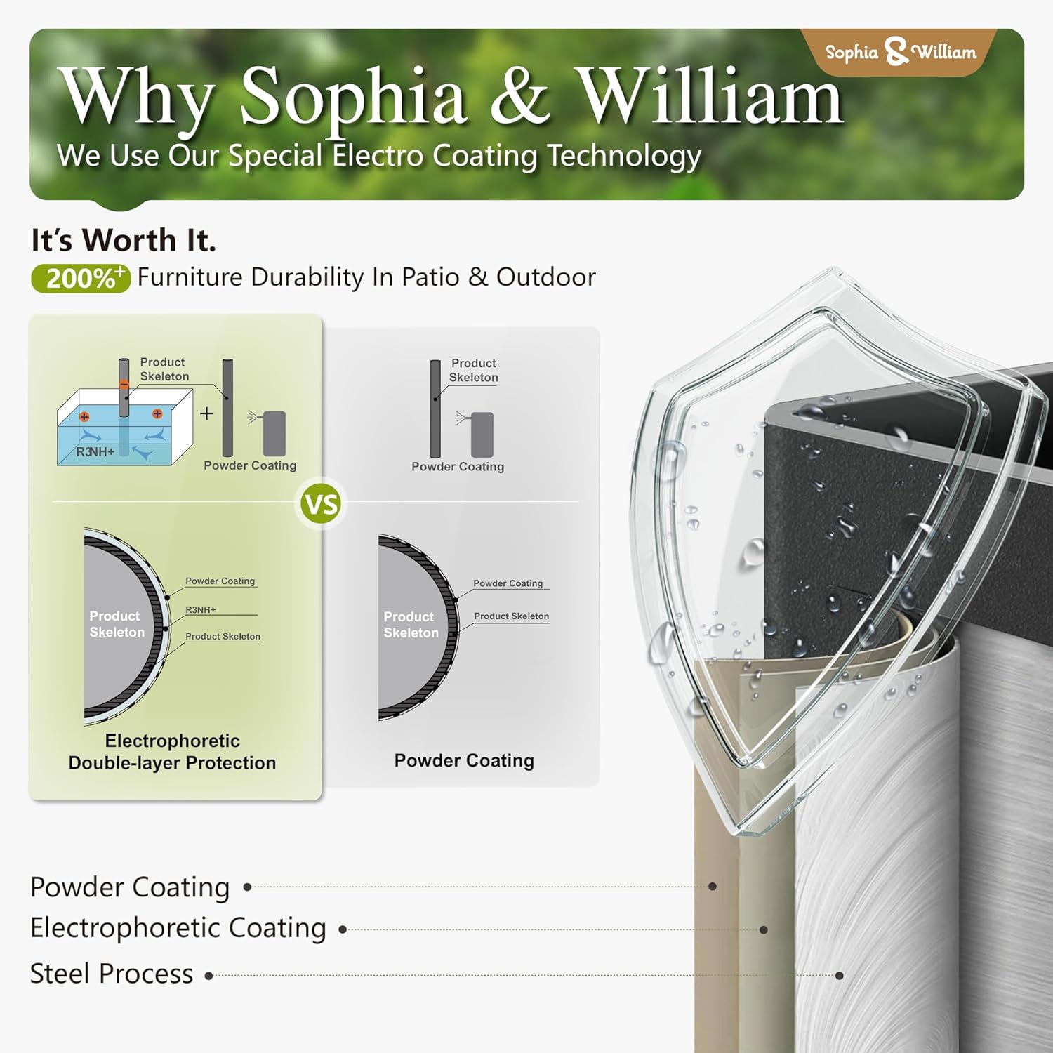 - All-weather Resistant: Sophia & William modern patio furniture set is built with thicken steel frame with E-coating for excellent rust-proof ability and and long-lasting. Steel slat cross bar on the bottom adds the stability and weight capacity up to 356lbs. With an steel frame, you'll get a clean look and create a luxurious outdoor living space for you and your guest