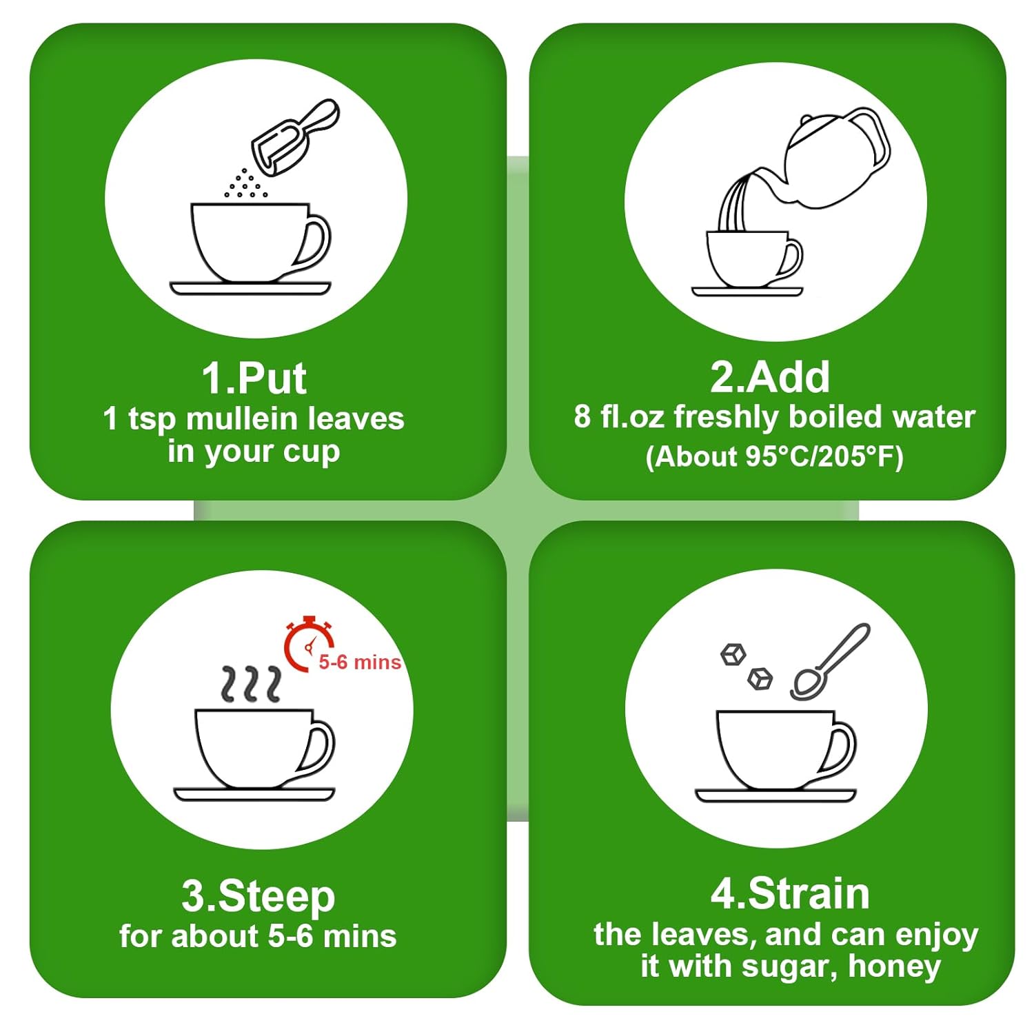 - 【BREWING METHOD】To prepare mullein tea, simply steep 1 teaspoon of dried mullein leaves in a cup of hot water for 5-6 minutes. You can strain the leaves or use a tea infuser for convenience.