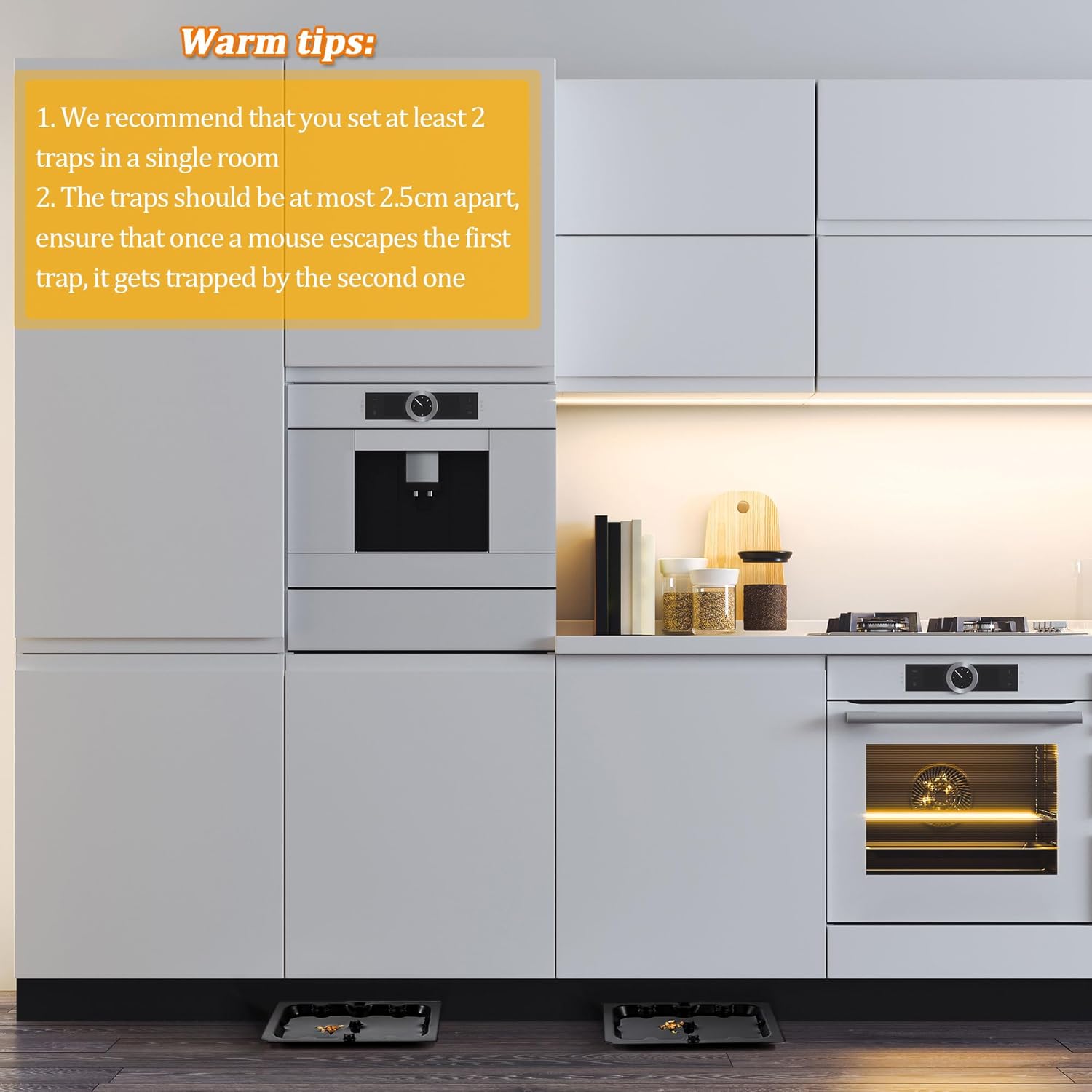 - [Mouse Glue Traps]: Qualirey sticky traps for mice can catch not only mice but also other common pests in your home, and suggested that you position sticky traps along active rodent runways, such as along wall, under large kitchen appliance, in cupboard, and other areas where rodents travel; Be sure to fit the glue trap flush against a wall where rodents will run over and stick to it