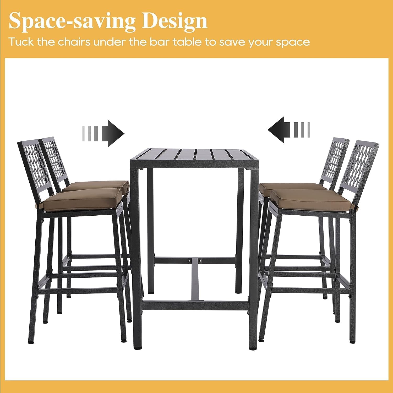 - Space-Saving Design: The bar height patio dining set is ideal for small space, and can be placed for corner. When the bistro bar set is not in use, the 4 bar stools could slide under the table, which could save your space