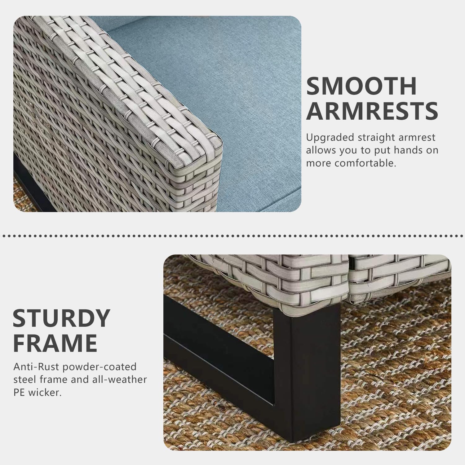 - 【Upgrated Elegant Design Sturdy&Durable】All made with Anti-Rust powder-coated steel frame and All-weather Hand-Woven PE wicker to make this patio furniture set is resistant to UV and weather,The patio conversation sets is totally upgraded with straight armrest and the heightened ergonomically curved backrest.
