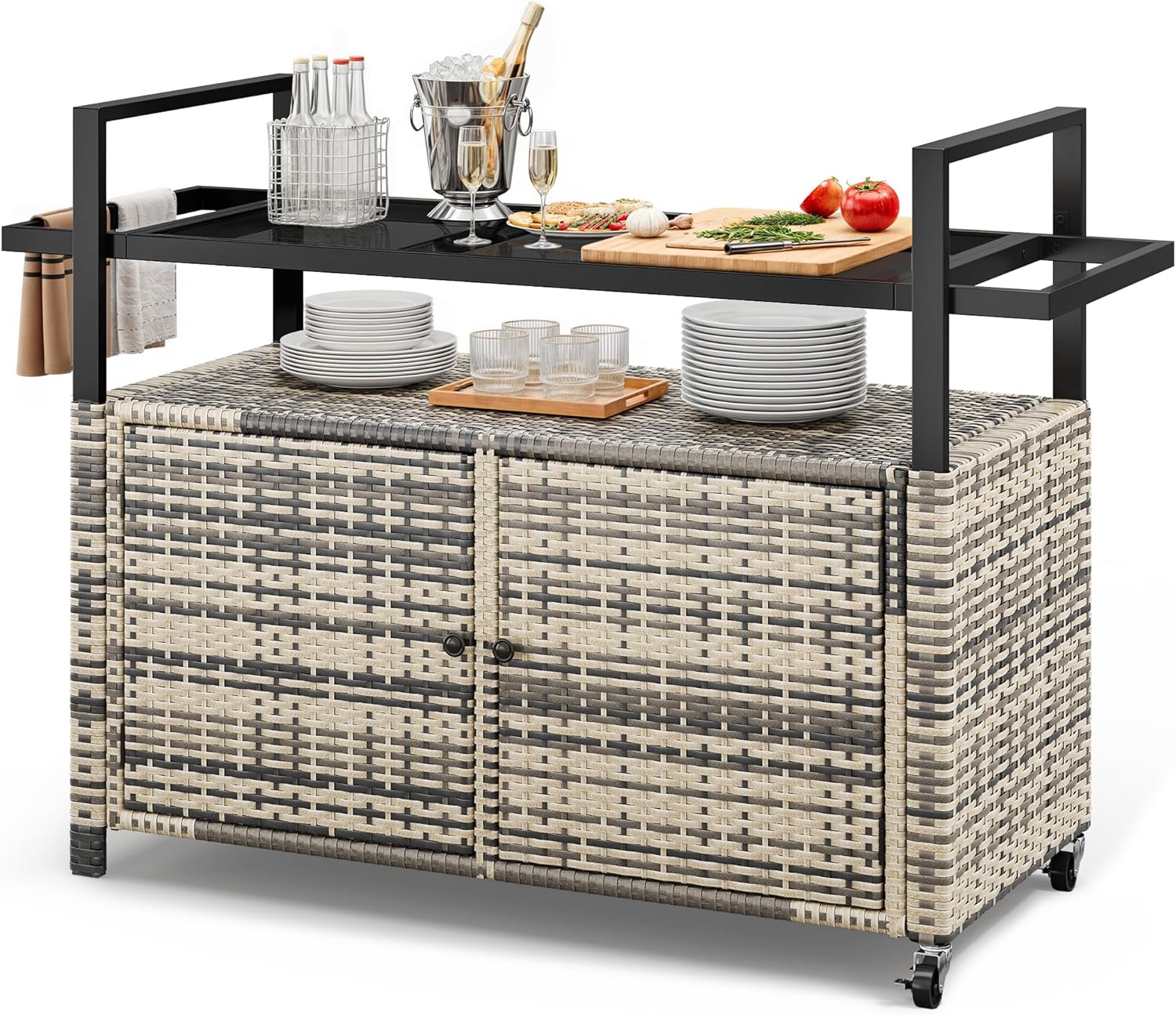 YITAHOME XL Outdoor Storage Cabinet, Outdoor Storage Cart with Wheels and Black Glass Table Top for Patio, Outdoor Cabinet for Poolside and Backyard (Gray Gradient)