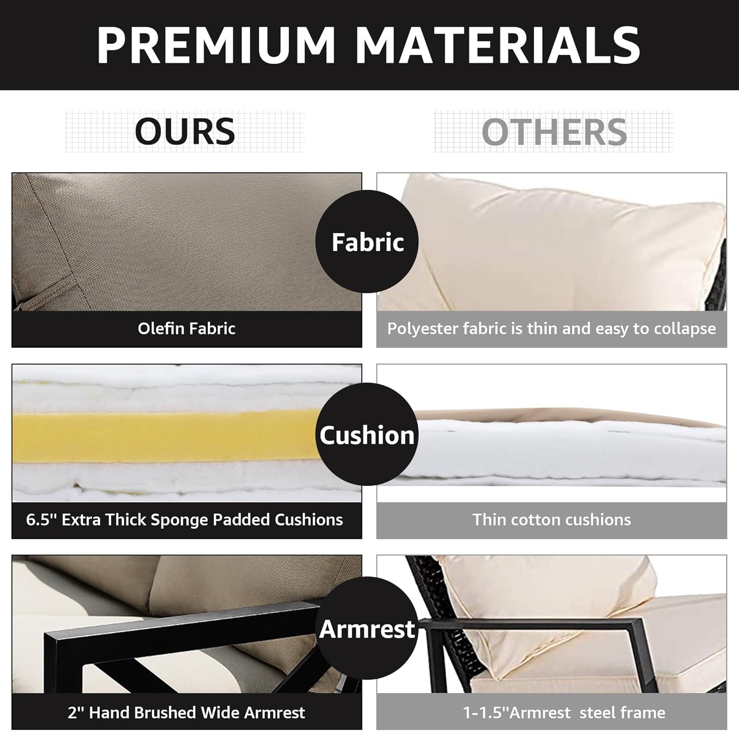 - Ergonomic Designed,Modern Unique Decor:with 105 °from unique designed X-shape handrail to backrest,outdoor furniture set provide ergonomic optimal comfort. Chairs and tables are made with thick,strong pipes to sit safe with 2 inch armrest (others about 1.5 inch only) and HIGHBACK Frame for more cozy. Outdoor Conversation Set has strong feet to protect the floor and increase the stability of furniture. Modern minimalist classic style outdoor couch furniture is the best decoration for backyard, balcony,garden, deck and home.