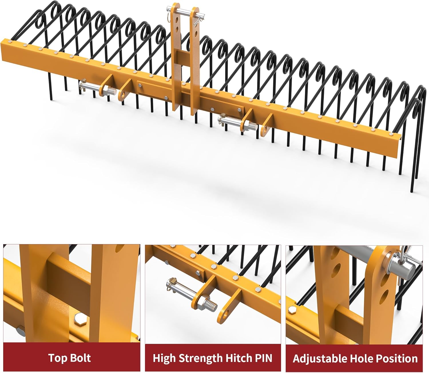 YITAMOTOR 60" Durable Powder Coated Steel Pine Straw Rake Steel Spring Landscape Rake Attaches to Cat-0 Cat-1,3 Point Hitch for Tractor, Yellow