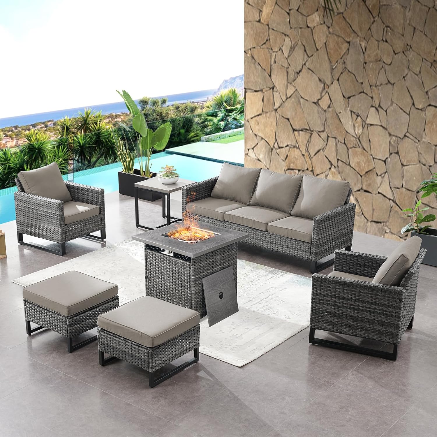 HUMMUH 7 Piece Patio Furniture with Fire Pit 30in 55,000 BTU,PE Wicker Outdoor Conversation Sets - Couch,Patio Chairs and Ottomans,Side Table for Porch,Garden,Backyard