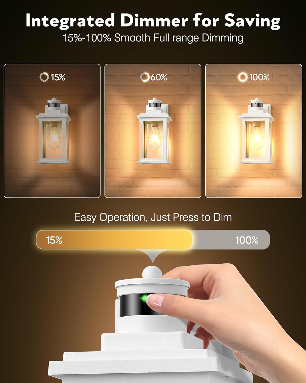 - Mode one-key switch: Introducing our outdoor wall lights for house wall mount switch modes with just one touch! With a quick press of sensor button, you can switch between DIM and ECO modes and D2D mode. Red light is DIM mode, green light is ECO mode. No special tools are required - it's easy! In addition, our porch lights are equipped with a dimmable function, which allows you to adjust the brightness between 10% and 50% during standby. By using this function, you can enjoy significant energy-saving effects.