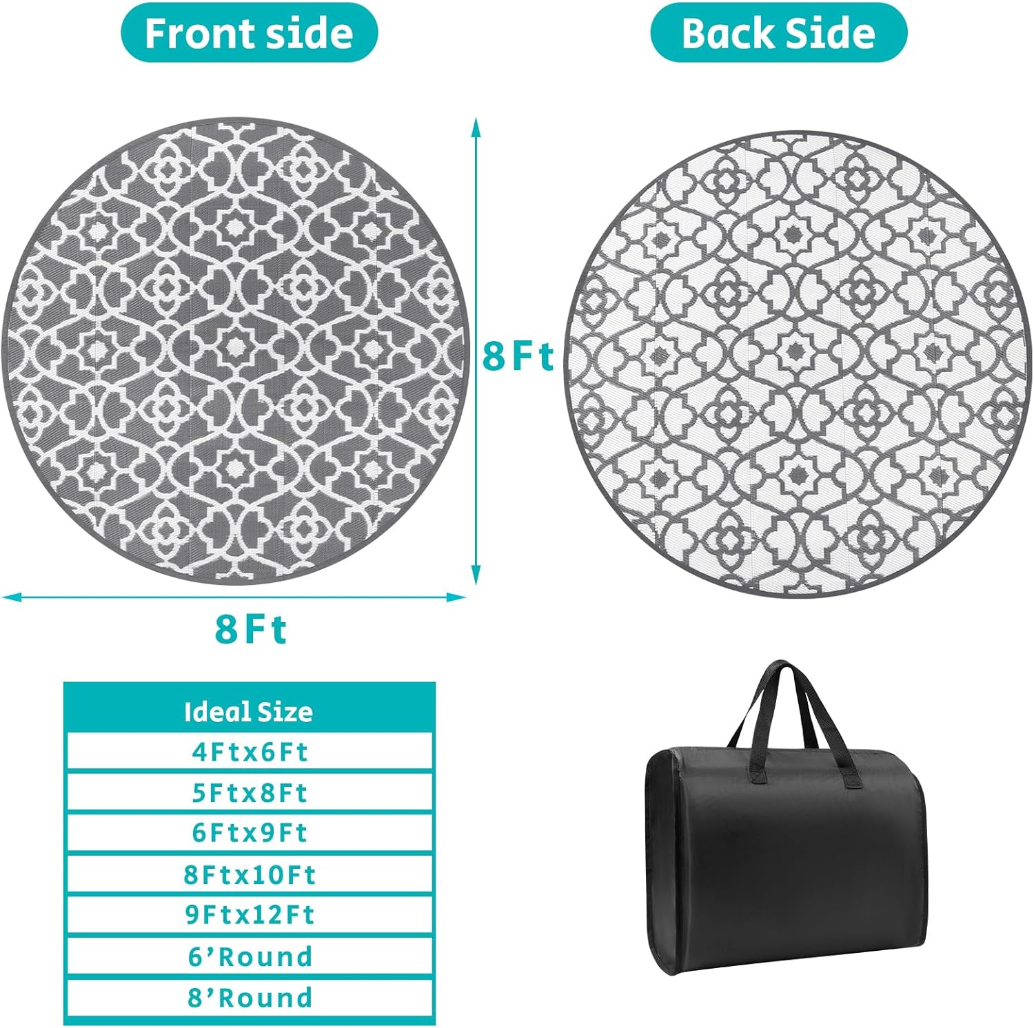 - Round Reversible Outdoor RV Mats 8Ft: The large 8 ft round outdoor porch rug with unique boho floral design, which makes it easy to use on patio,camper, deck, beach, backyard. And this outside camping rug is reversible, two-sided design allows you to have two different looks.