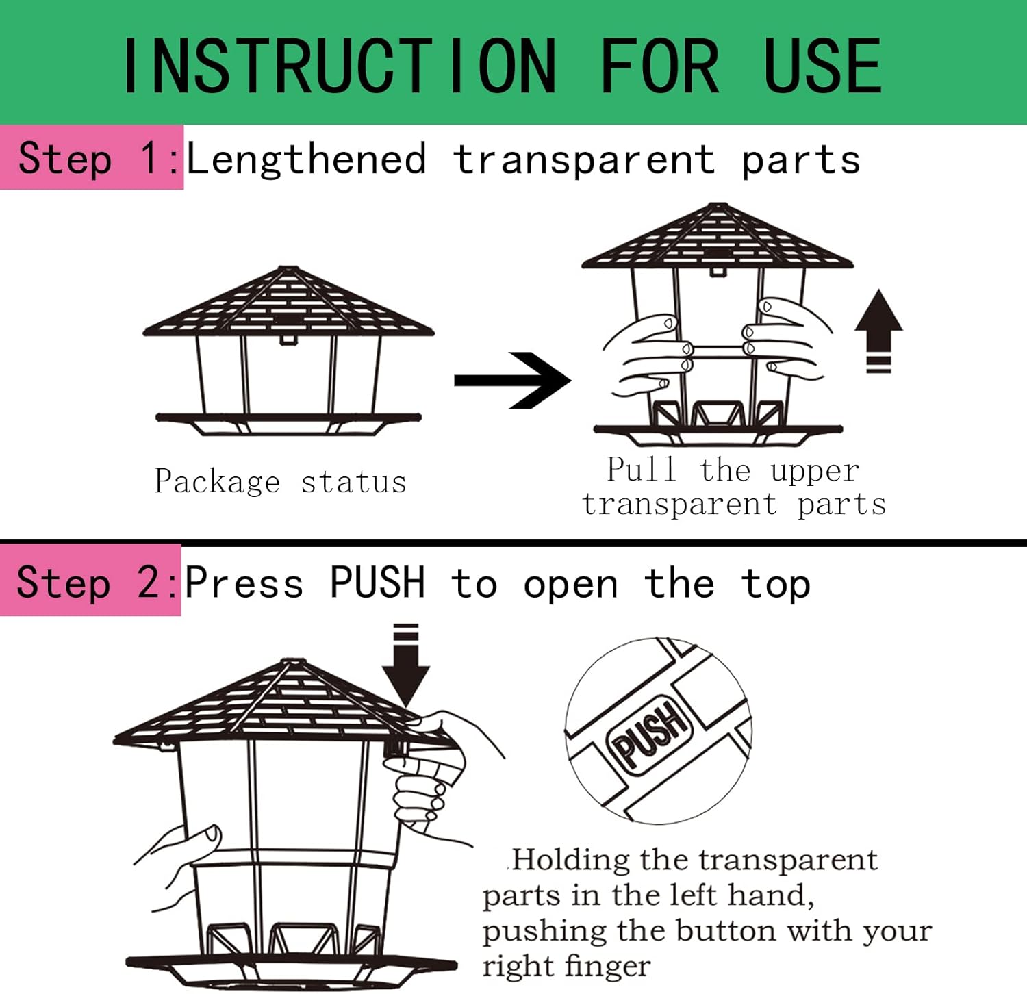 - 【SCENES TO BE USED】Press PUSH to open the lid, put the wild bird seeds, sunflower seeds for birds , safflower bird seed etc, into the bird feeder, close the lid, and then hang the bird feeder under the eaves or in the garden.