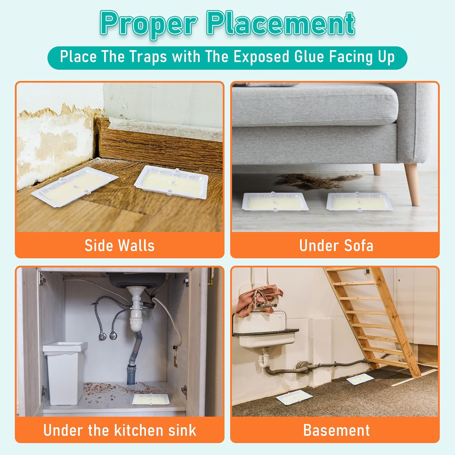 - [Mouse Glue Traps]: Qualirey sticky traps for mice can catch not only mice but also other common pests in your home, and suggested that you position sticky traps along active rodent runways, such as along wall, under large kitchen appliance, in cupboard, and other areas where rodents travel; Be sure to fit the glue trap flush against a wall where rodents will run over and stick to it