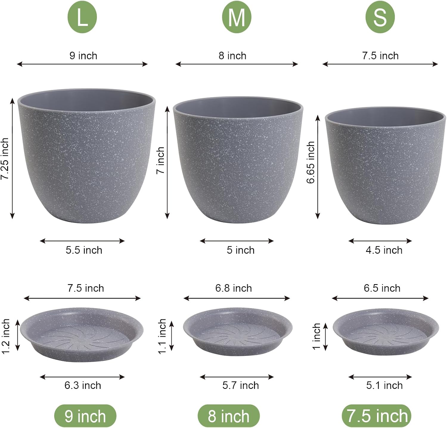 Modern Plant Pots Set, 9/8/7.5 inch Plastic Planters for Indoor Plants, Stylish Flower Pots with Drainage Holes and Saucers for House Plants and Flowers, Grey Speckles