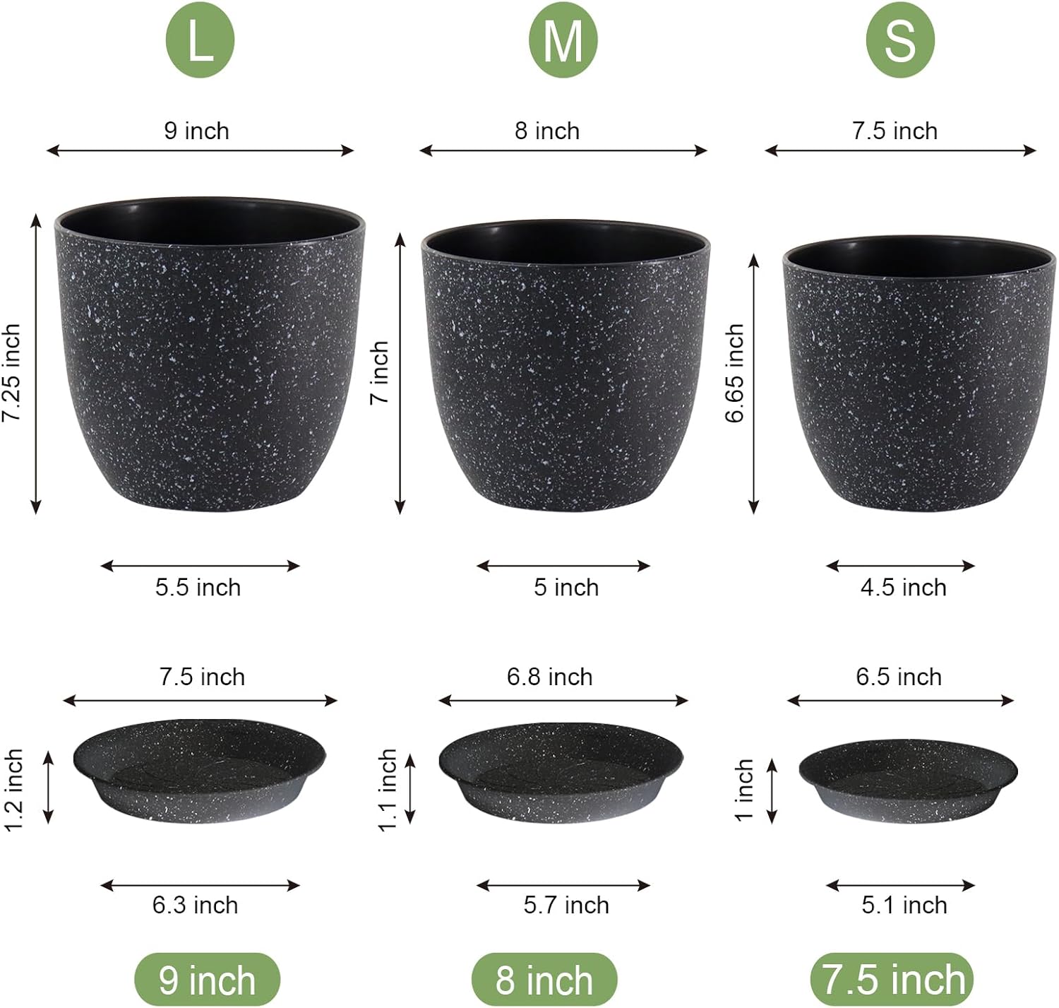 Modern Plant Pots Set, 9/8/7.5 inch Plastic Planters for Indoor Plants, Stylish Flower Pots with Drainage Holes and Saucers for House Plants and Flowers, Black Speckles