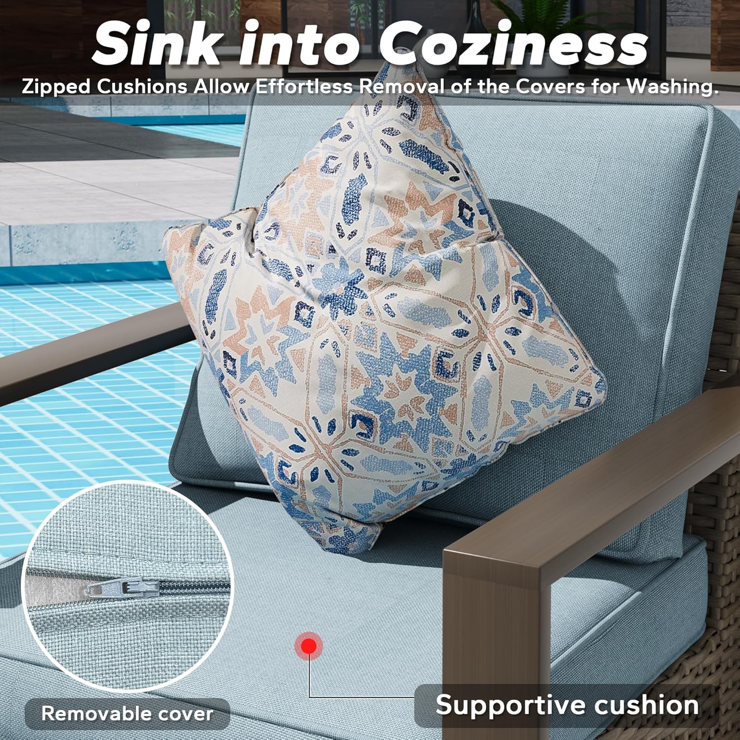 - PREMIUM OLEFIN FABRIC CUSHIONS: The wicker chair comes with detachable cushions made of olefin fabric, offering robust UV protection and water resistance. With 100% polyester filling and a 3.35" thickness, the cushions provide maximum coziness while seated.