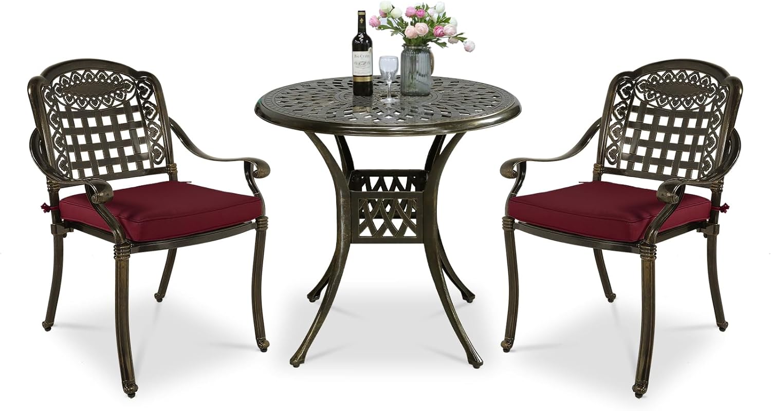 - 【STYLISH APPEARANCE】 - This 3-Piece Dining Set includes 2 stylish and comfortable chairs and 31" round cast table. Elegant cast accents scroll across the chairs and table top, adding a level of sophistication and craftsmanship to the collection. Perfect addition to your patio, yard, deck, or porch.
