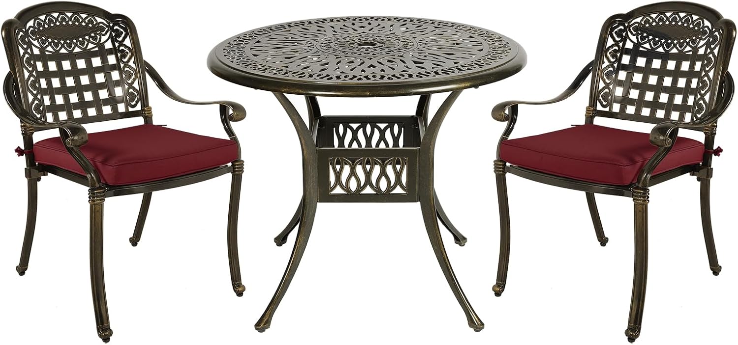 MEETWARM 3 Piece Patio Bistro Set, Outdoor All-Weather Cast Aluminum Dining Furniture Set Includes 2 Chairs with Cushions and a 35.4” Round Table with Umbrella Hole for Garden Deck, Chili Red