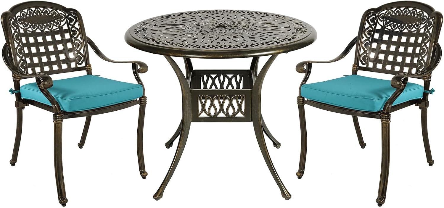 MEETWARM 3 Piece Patio Bistro Set, Outdoor All-Weather Cast Aluminum Dining Furniture Set Includes 2 Chairs with Cushions and a 35.4” Round Table with Umbrella Hole for Garden Deck, Ocean Blue