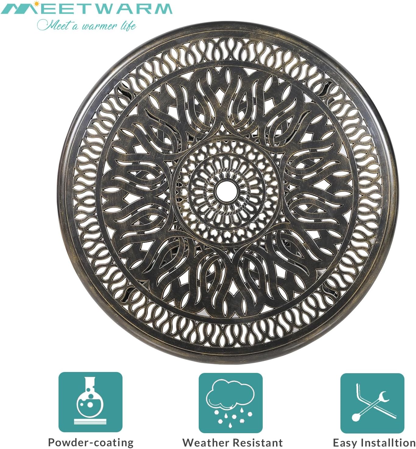 - 【Weather Resistant】 - At MEETWARM, we bring you the best outdoor furniture available. Our table and chairs are made of sturdy and durable cast aluminum with rust-resistant powder coated surface for years of outside use. If you use this set by the pool, its all-weather quality helps prevent water damage caused by wet swimsuits and splashing