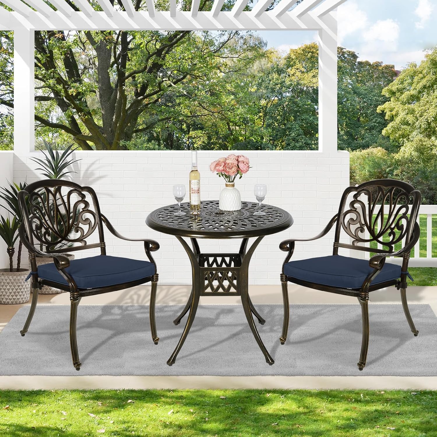 MEETWARM 3 Piece Patio Bistro Set, Outdoor All-Weather Cast Aluminum Dining Furniture Set Includes 2 Cushioned Chairs and a 31” Round Table with Umbrella Hole for Garden Deck, Navy Blue