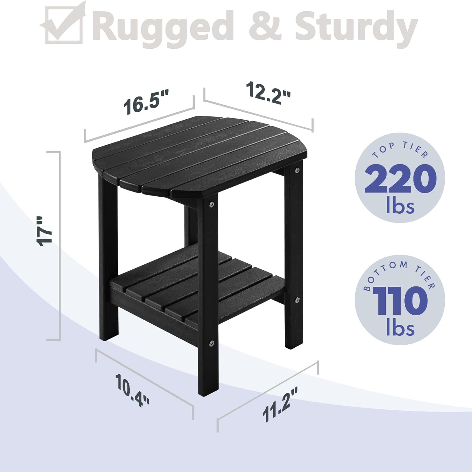- ă2-Tier Storage Space & Smooth SurfaceăThe design of 2-tier makes the outdoor side table have more space to store items such as food, drink, books and flowers. The upper layer can hold 210 lbs, and the lower layer 110 lbs. The outdoor table also has a smooth surface and smooth edges, free of burrs to prevent puncturing or scratching the skin.