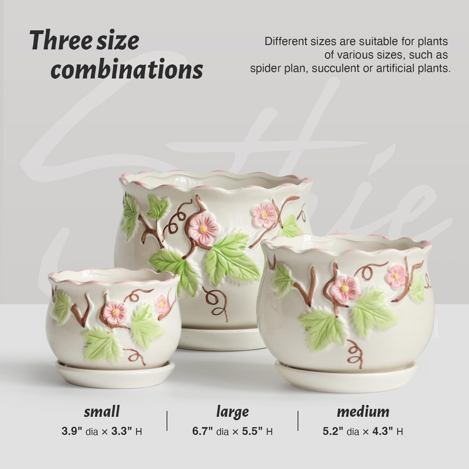 - MODERN HOME DECOR : These garden plant pots are made of ceramic and come in three sizes: Small width is 3.9 inches, Medium width is 5.2 inches, , and large width is 6.7 inches. They are fired at high temperature, so they are durable and lightweight.