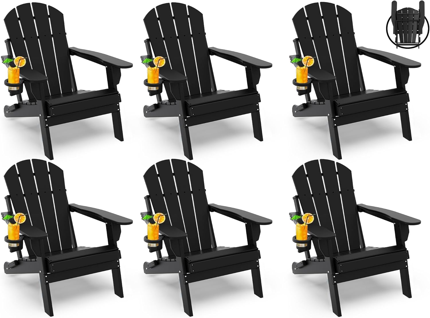 GREENVINES Folding-Adirondack-Chairs-Set-of-6 | HDPE Plastic | Fire Pit Chair | All Weather | Cup Holder | Black | for Deck Backyard Patio Outdoor Garden