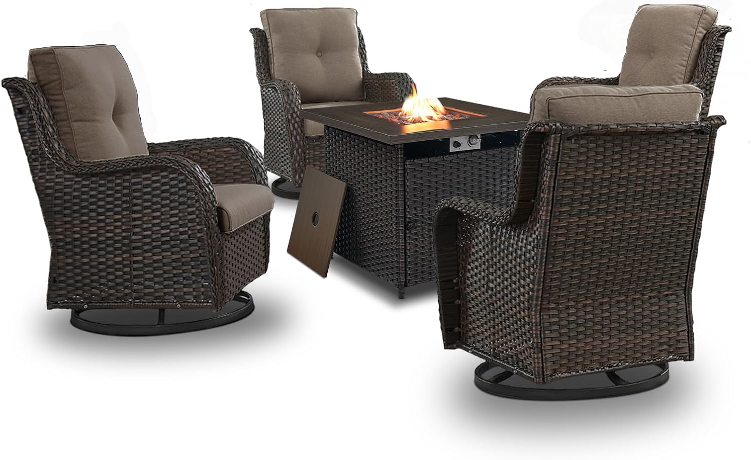 5 Pieces Patio Wicker Furniture Set - 4 Outdoor Swivel Rocker Glider Chairs with 50000BTU Propane Fire Pit Table, Warm Patio Conversation Set Grey Cushion Perfect for Casual Gathering