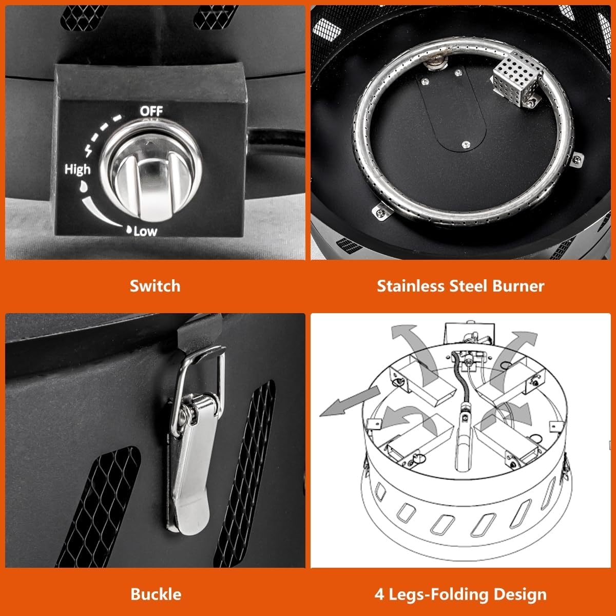 - [Compact and Easy Carry]: Travel size gas fire pit is lightweight and portable; easily set up in minutes with no tools required. The lid of fire pit comes with a handle, so you can carry it away without a bag. The 4 legs of propane fire pit are foldable design, more efficient storage space.Equipped with a gas tank supoort which keep tank not tip over.