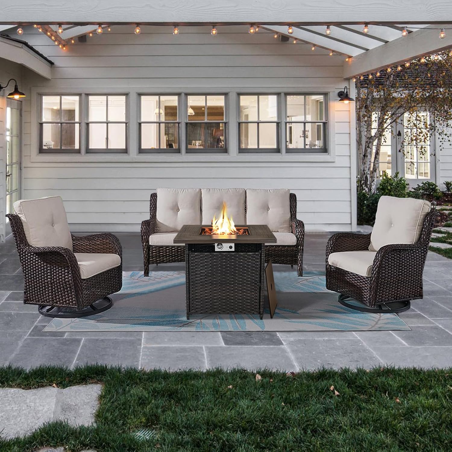 - 4.Embrace Warmth and Ambiance: Elevate your outdoor gatherings with the included propane fire table. Perfect for chilly nights, it adds a touch of warmth and ambiance to your space. Make lasting memories as you gather around, enjoying drinks and snacks in style and comfort.