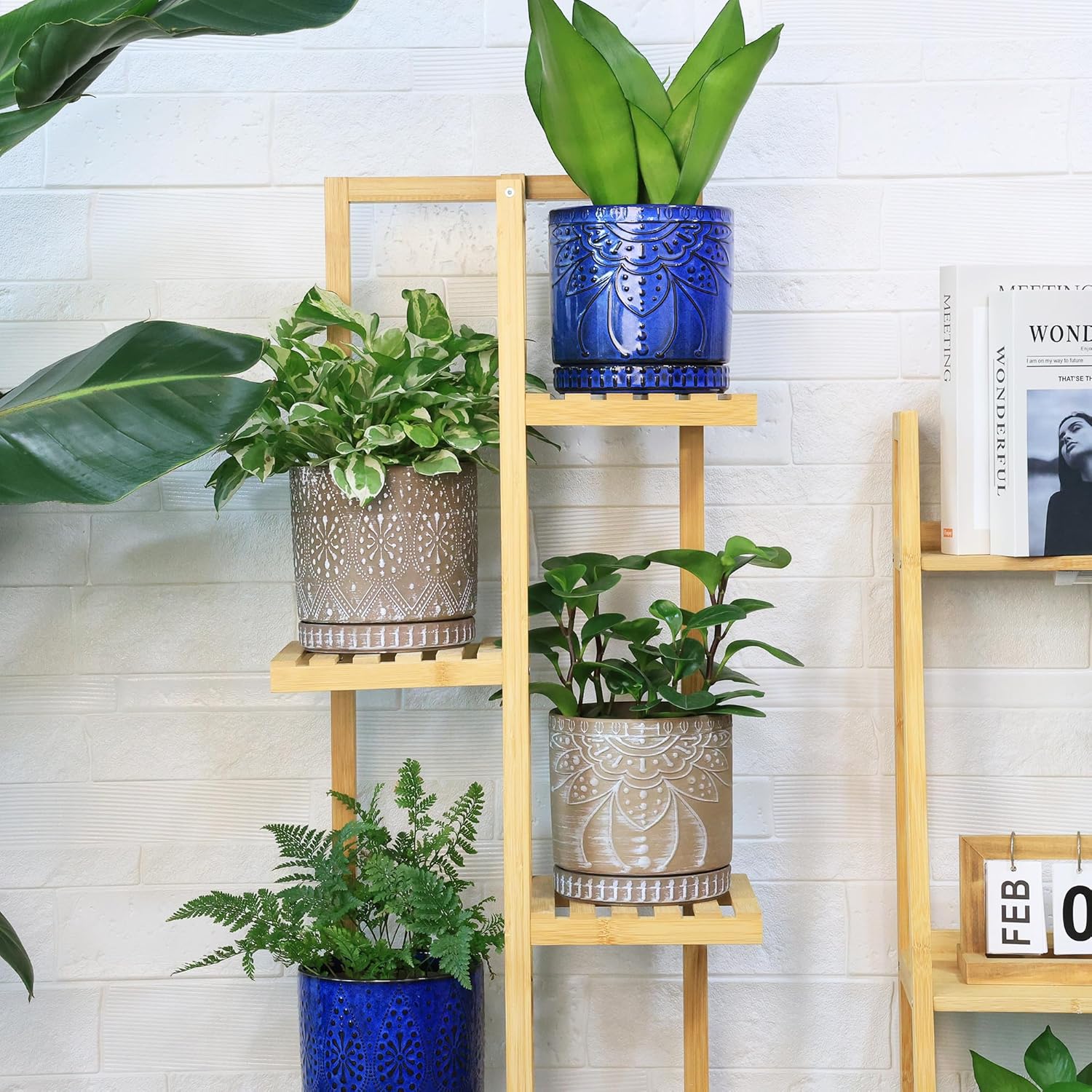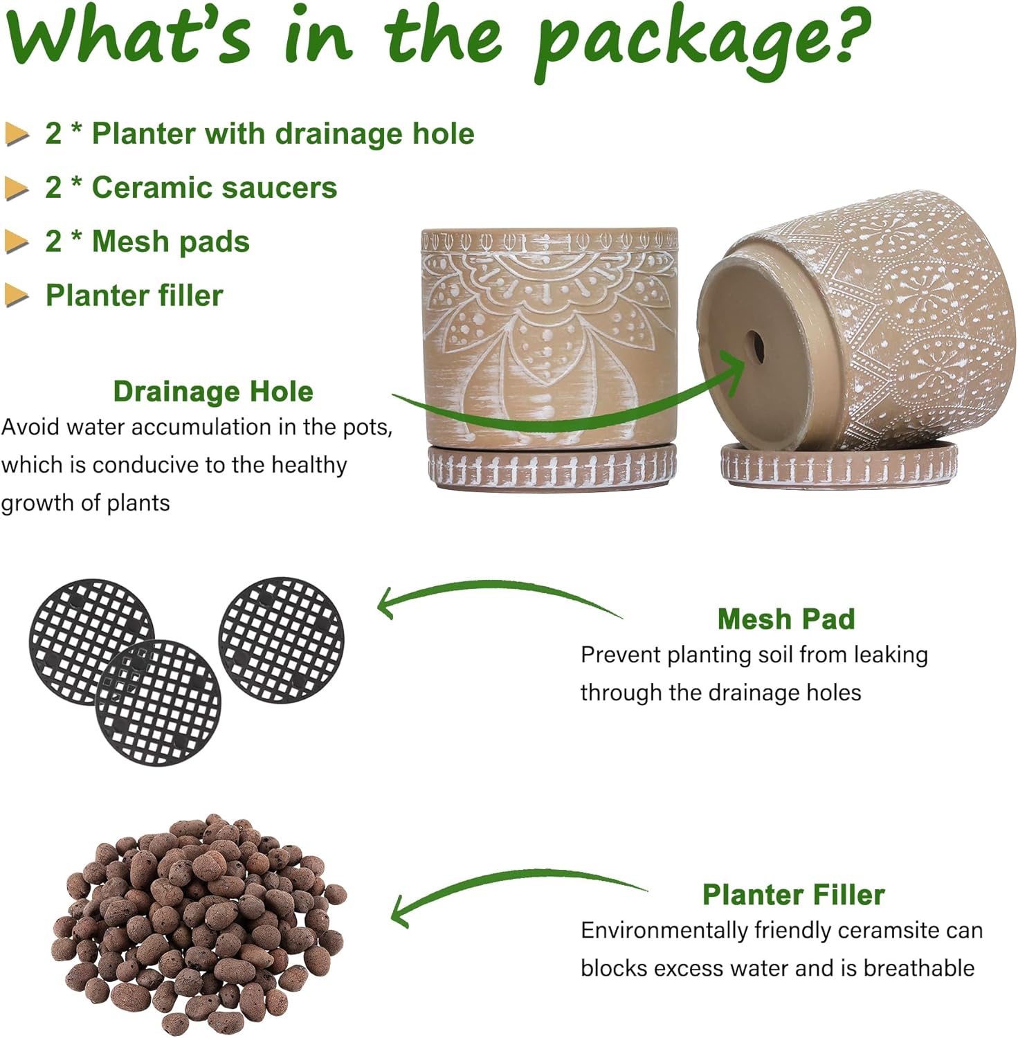 - Size & Package : 6 Inches set of 2. Package: contains 2 ceramic flower pots, 2 ceramic saucers and 2 mesh pads(NOT INCLUDE PLANTS)