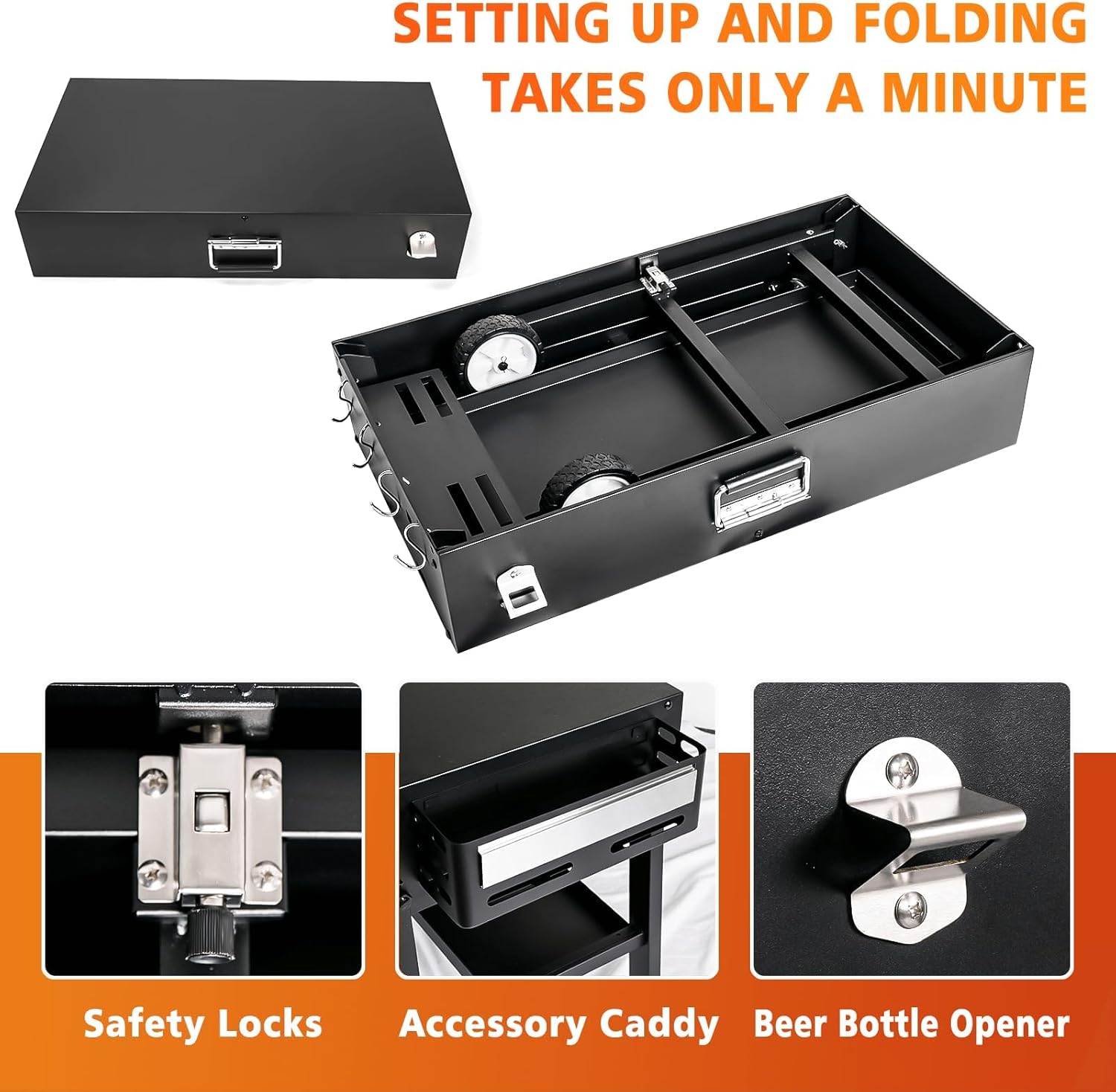 - [Foldable and Portable Design for Easy Transport] - This foldable grill table is designed like a suitcase with a built-in handle, making it highly portable for any outdoor adventure. With a quick, 5-minute setup, simply unfold the table legs, position the bottom shelf, and attach the caddy and paper towel holder. The safety lock keeps everything securely in place, making it ideal for tailgating, camping, parties, and RVing.