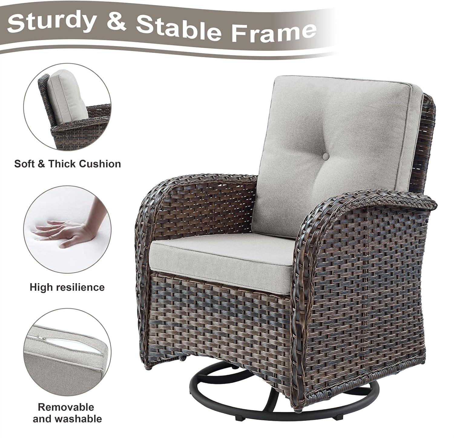 - Swivel Rocking Chairs:Resting on chairs with sturdy round metal base allows to glide gently and swivel 360° for relaxing, with seat and back cushions contribute to comfortable support, making the outdoor set a perfect addition to transform your patio.
