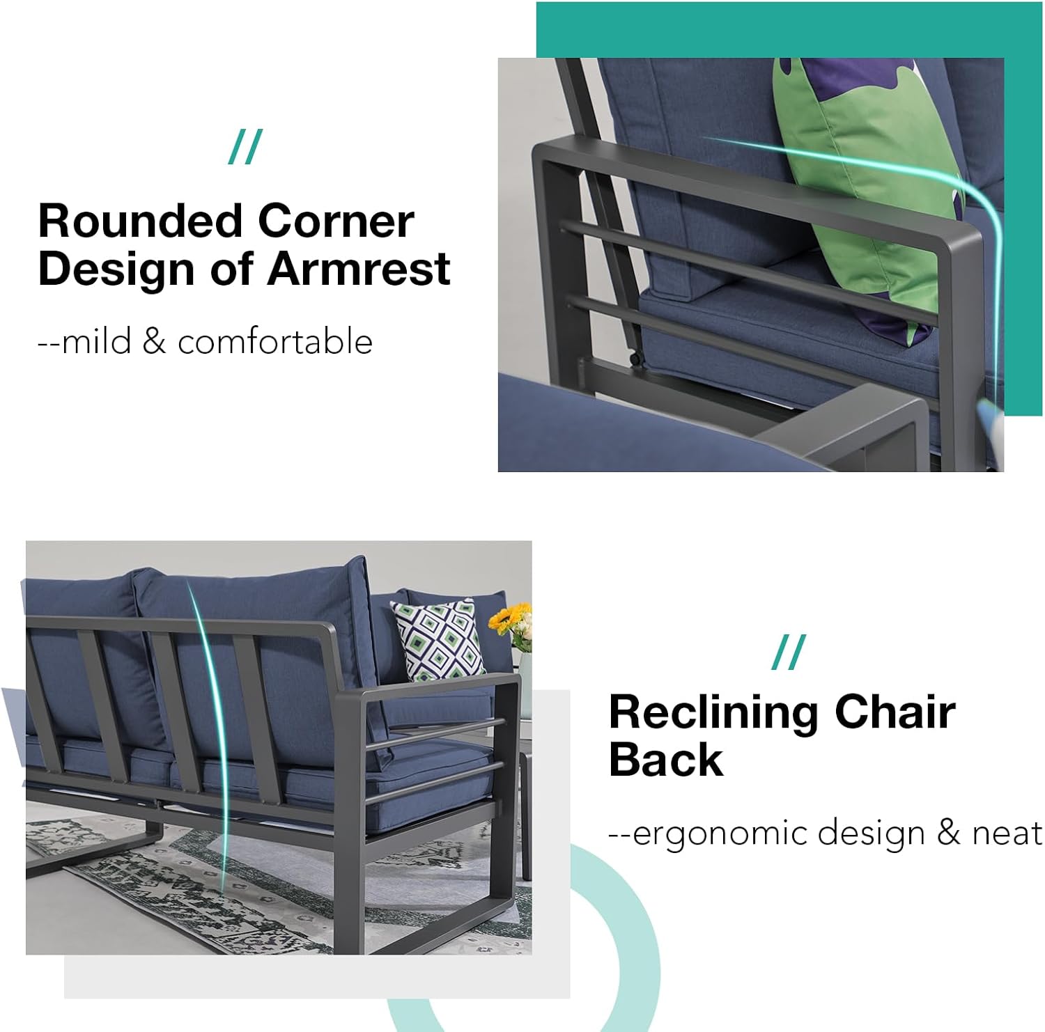 - [Designed for Comfort and Style]: Abandoning the conventional styles, the exterior design of the aluminum outdoor couch is created by the leading group. Engineered with ample and reclining back support for maximum comfort. The unique open and round-corner design for armrests with 2 round tubes on the sofas gives the outdoor 3-seater sofa an airy and mild silhouette. Rounded corner legs are adjustable to level on any type of surface.
