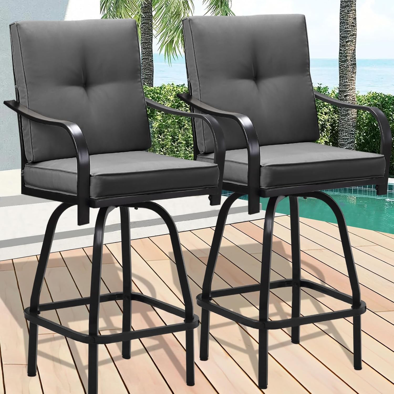 Patio Swivel Bar Stools, Outdoor High Back Swivel Bar Stool Chair Set of 2 with Cushion & All Weather Steel Frame, Dark Gray