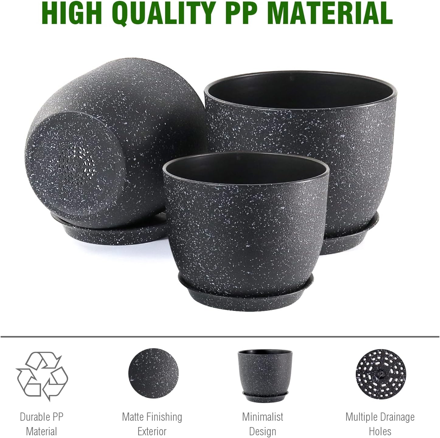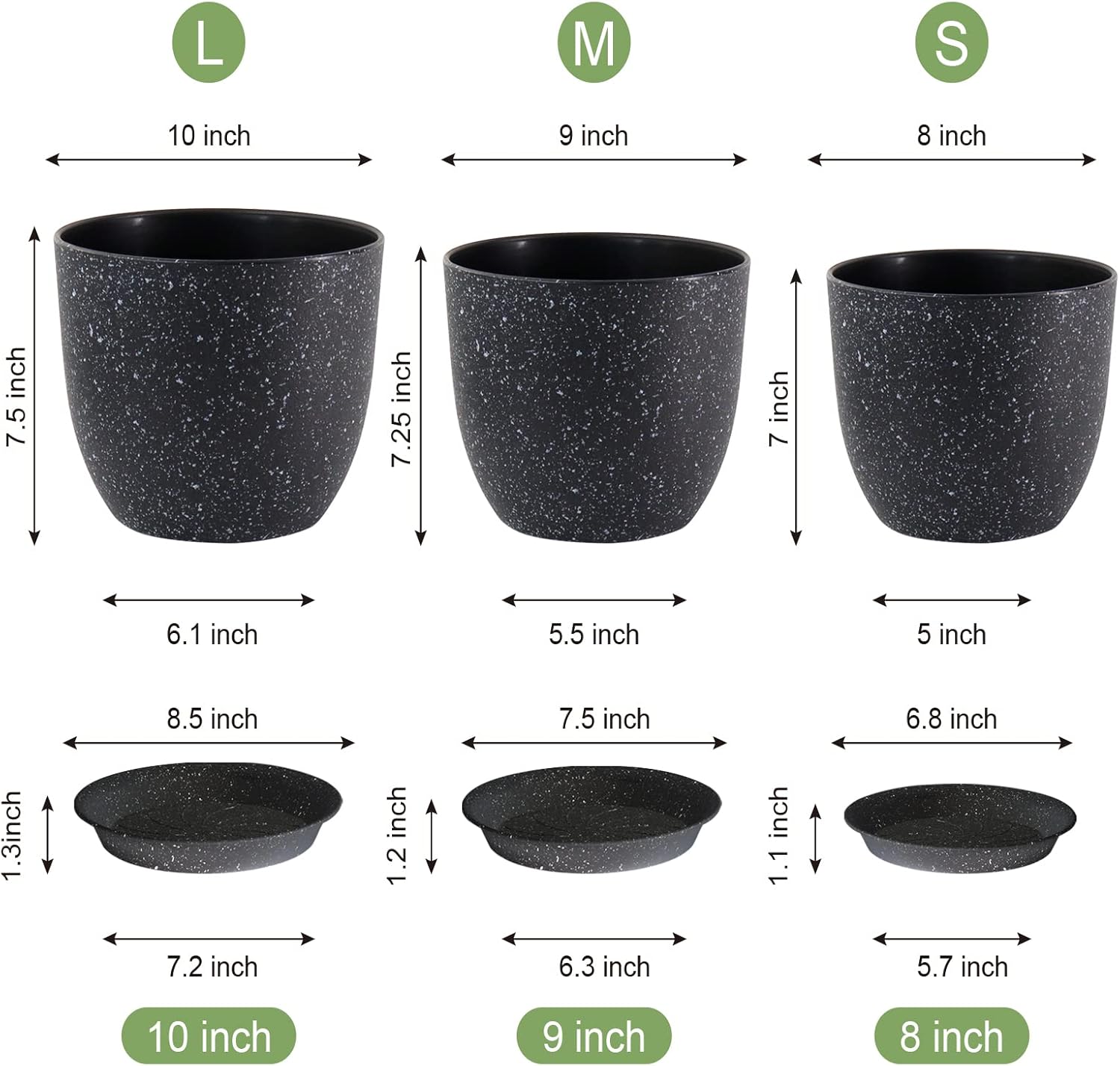 Plant Pots 10/9/8 inch, Set of 3 Modern Decorative Plastic Planters with Drainage Holes and Saucers for Garden House Plants, Flower Pots for Indoor Outdoor Plants, Speckled Black
