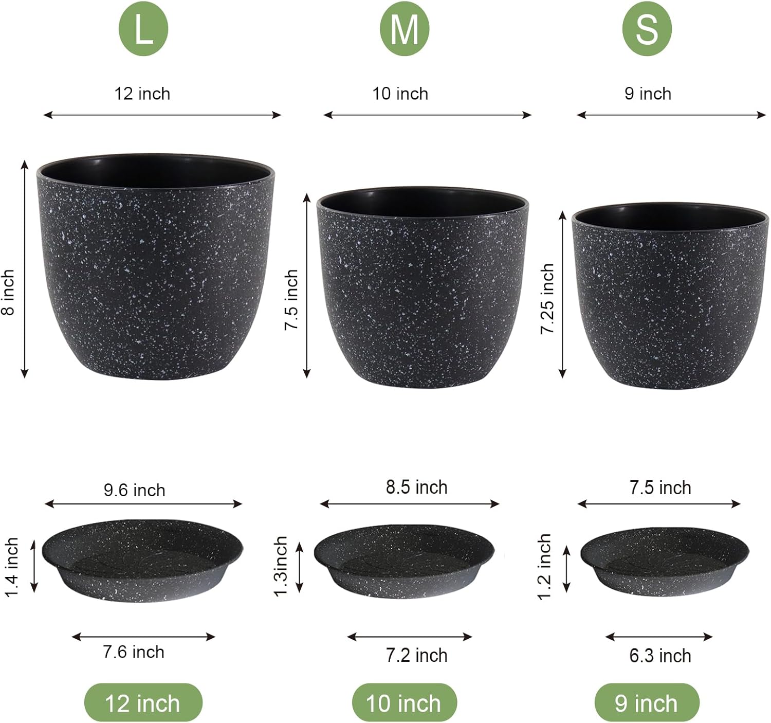 Large Flower Pots 12/10/9 inch, Set of 3 Modern Decorative Plastic Planters with Drainage Holes and Saucers for Garden House Plants, Plant Pots for Indoor Outdoor Plants, Speckled White